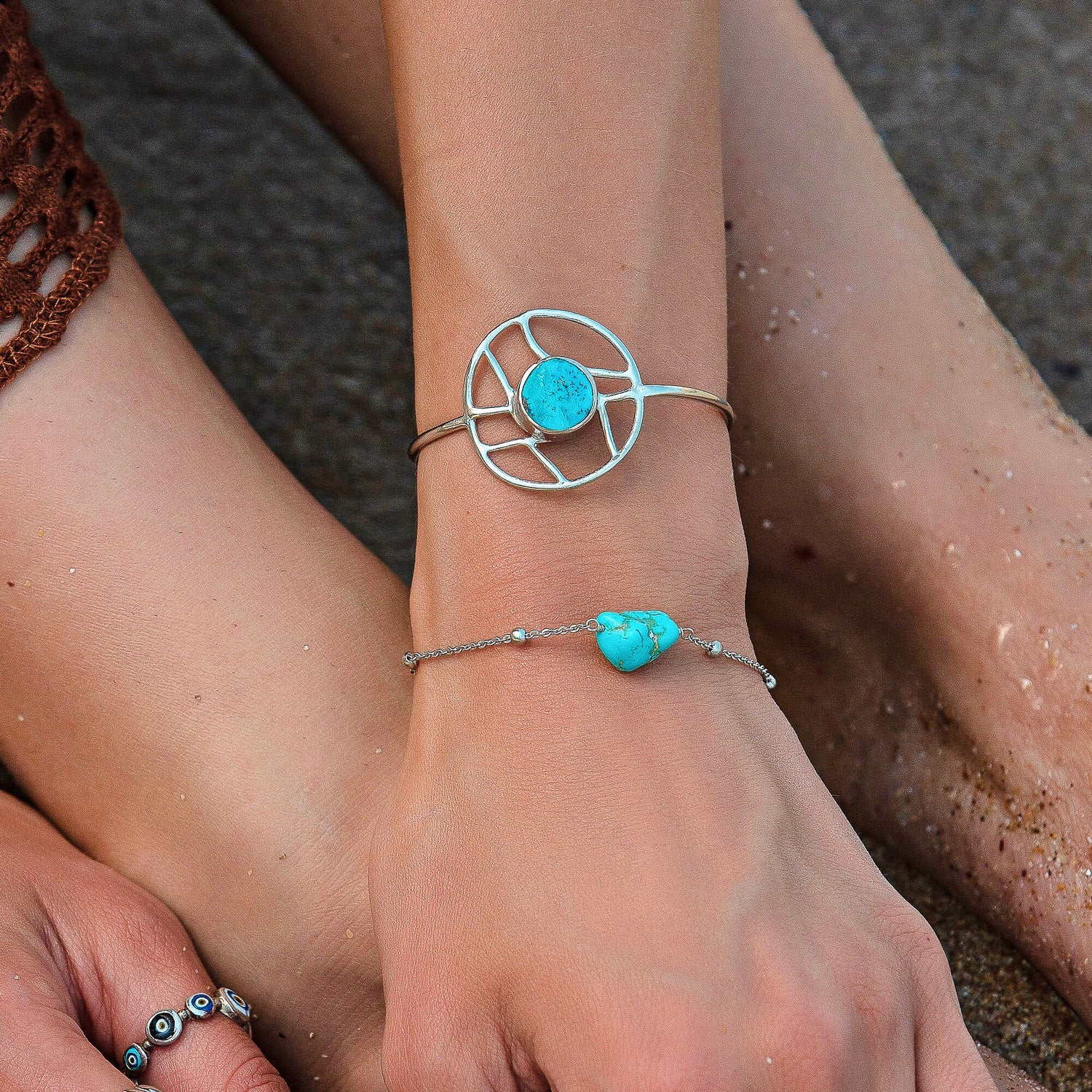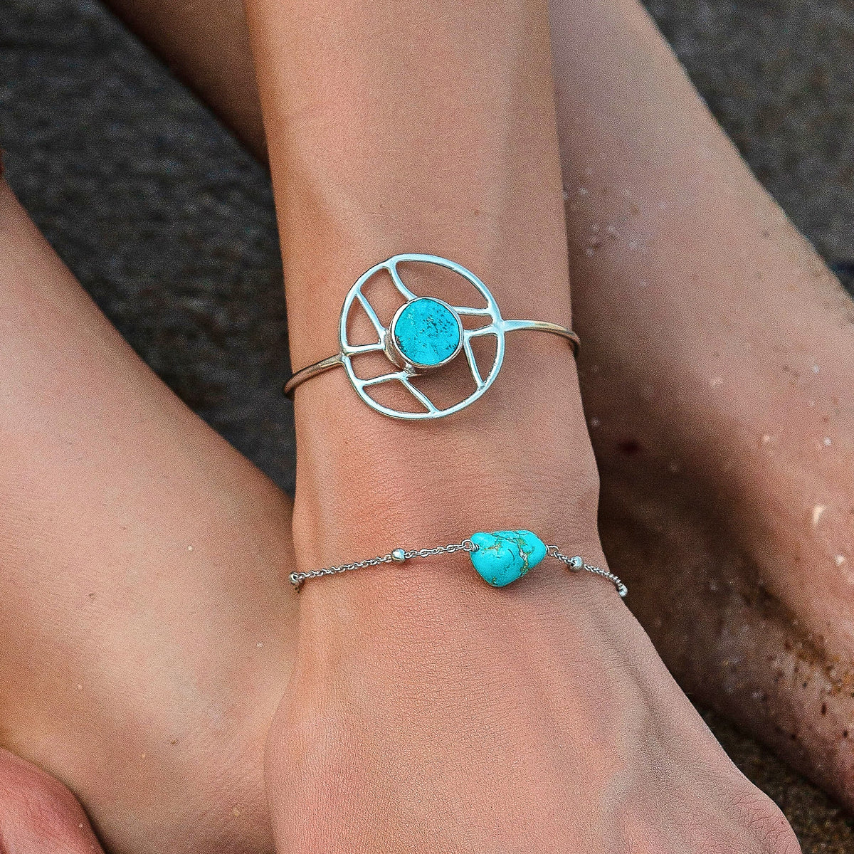 This adjustable cuff bangle is made from silver and features a natural turquoise gemstone orb. The natural irregularities of the stone should be celebrated. It should be taken off when washing hands or using cosmetics.