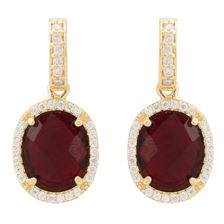 These exquisitely regal oval gemstone drop earrings are pure elegance in design. Make this super sparkly drop earring your everyday wardrobe staple. The multifaceted oval gemstone with illustrious cz detailing, which highlights the beauty of the central stone, reflects the light which dazzles from day to night. These earrings make an impact but are comfortable to wear. With associations with the heart, blood, inner fire, and life force, garnets have long been considered symbols of love. Garnet symbolism also extends to friendship. Because of garnet's association with pomegranate seeds, the stone has come to stand for the safe return of a friend or loved one. A great pairing with the Beatrice Necklace and Bracelet.