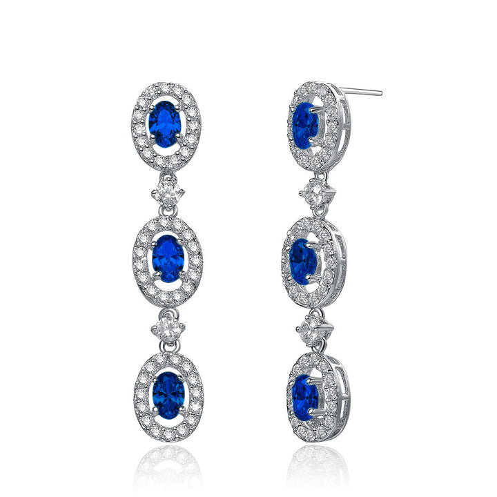 These geometric drop earrings feature three oval shimmering cubic zirconia stones decorateds with smaller round stones. Crafted of .925 sterling silver, the earrings secure with butterfly clasps. Available in clear and Sapphire color stones.