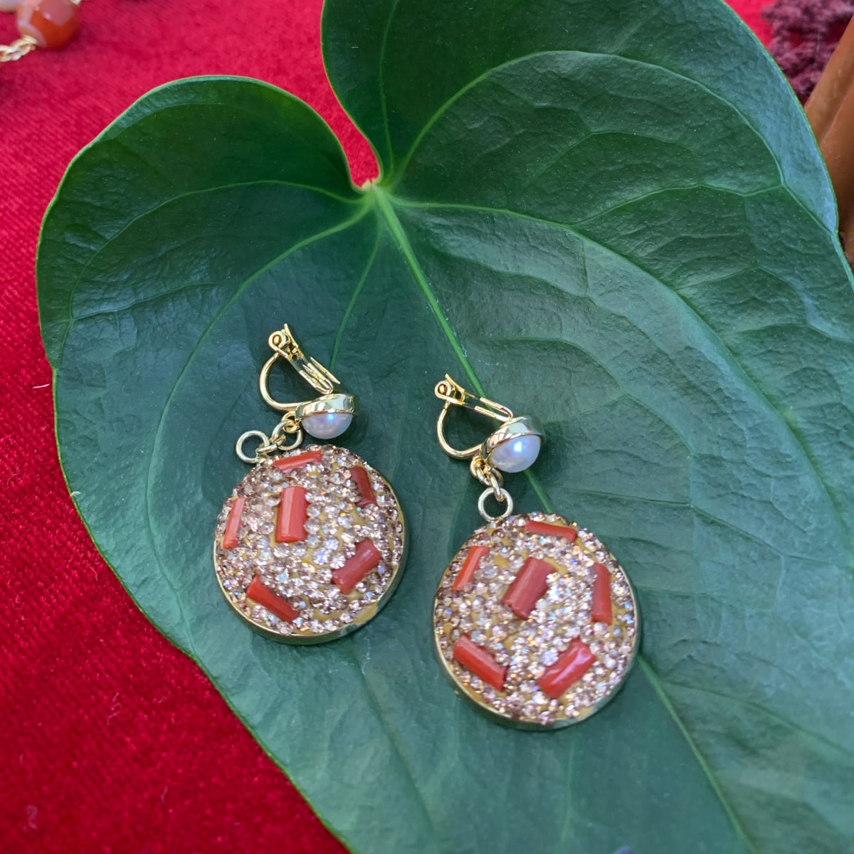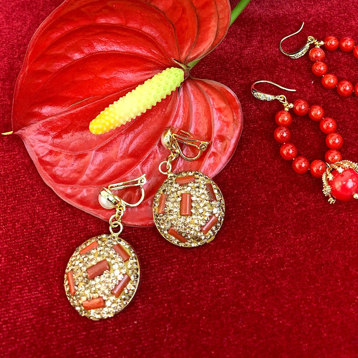 These handmade clip-on earrings are crafted from golden-plated brass findings and feature corals bordered with rhinestones.