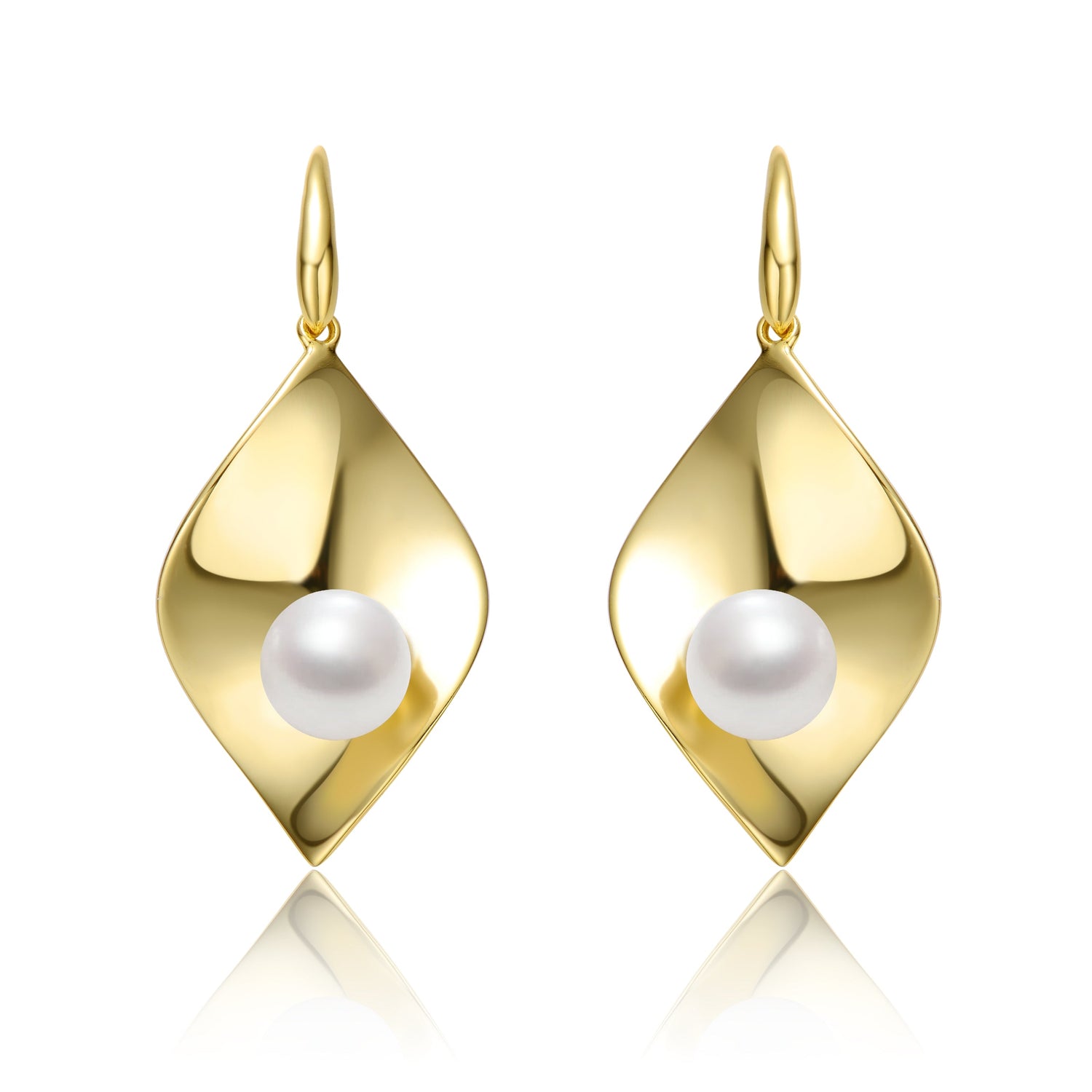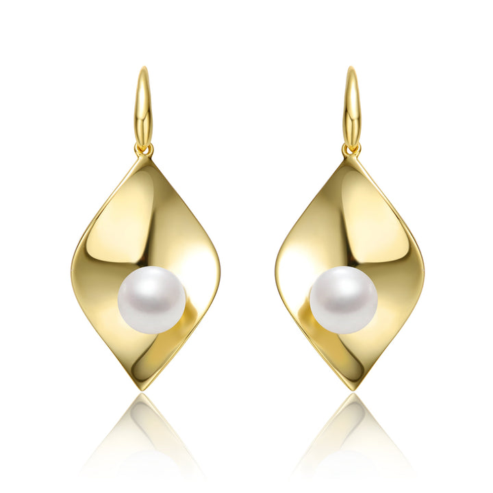 Sterling Silver 14k Yellow Gold Plated with White Pearl Lily Pad Dangle Drop Wire Earrings. These nature-inspired 14k yellow gold plated sterling silver earrings feature a lily pad design, shimmering in a rich gold shine with white pearls elegantly in the middle. Celebrate your next birthday with pearls (June birthstone), holiday, or anniversary by gifting these tranquil earrings to any loved one or treat yourself. Slim wire backings make these earrings easy to place on and remove from the ears.