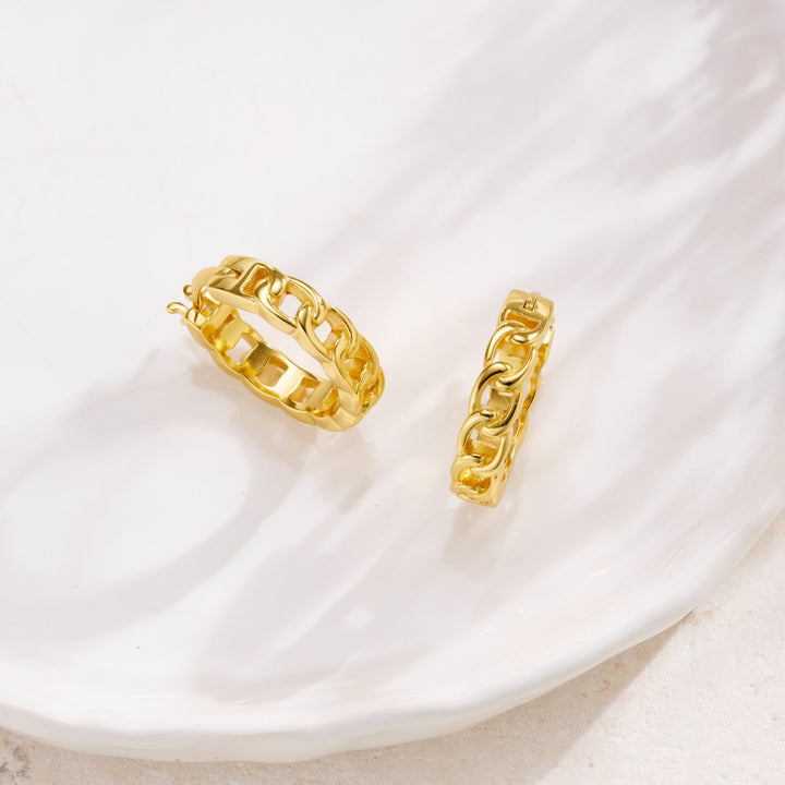 These hoop earrings are made from 18ct yellow gold plated 925 Sterling Silver. They feature a chain-link design.
