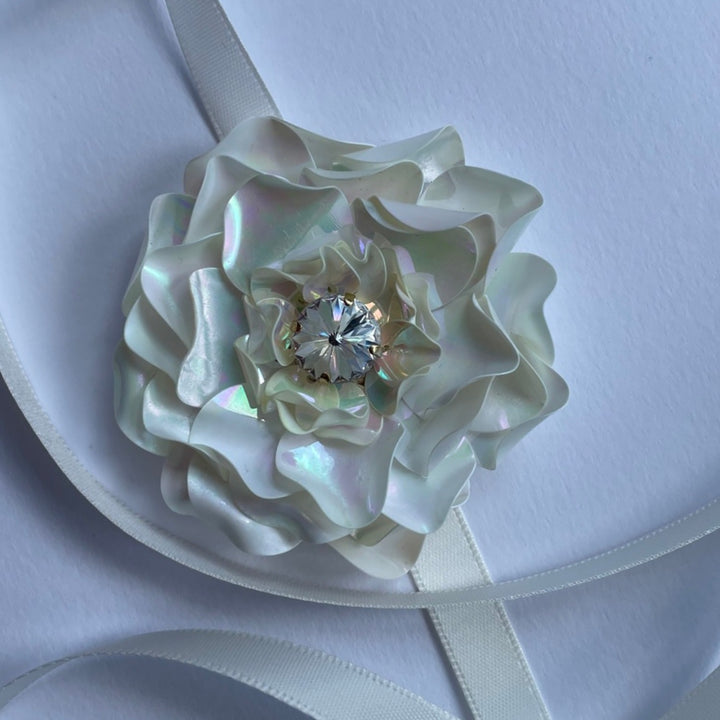 This Camellia Choker Shell by Pinar Ozevlat is a gorgeous and versatile accessory. The elegant camellia flower design is both feminine and chic, with an additional pin on the back that allows you to style it in a number of ways. Crafted with the highest standards of quality, this choker is a romantic and sophisticated piece that will not go unnoticed.