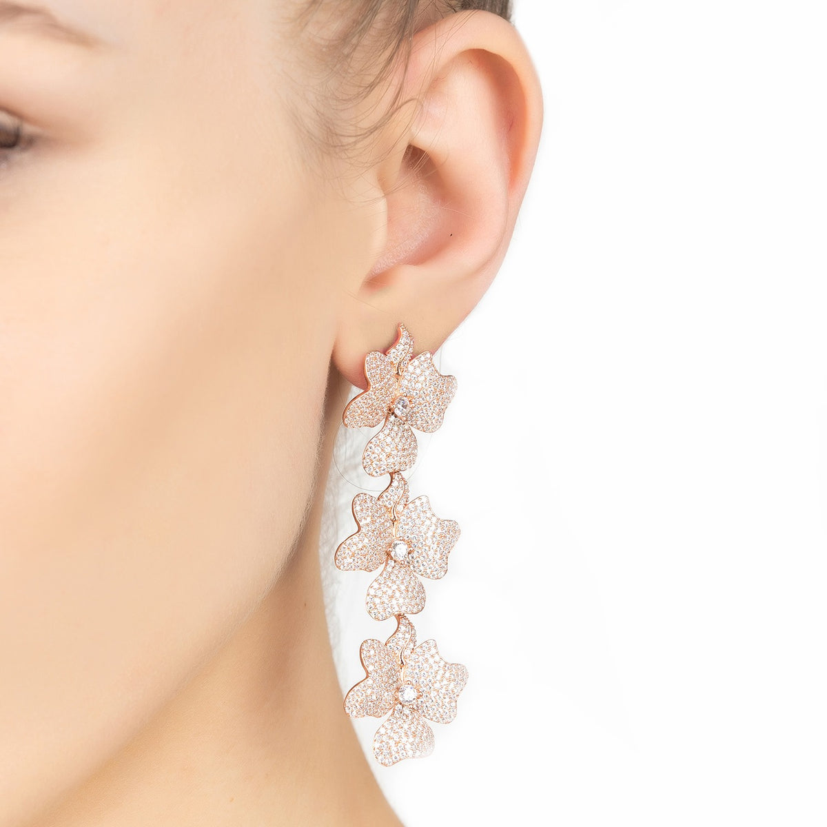 Ideal for those who love statement jewellery with added sparkle. Make these floral inspired earrings your new timeless treasures. Perfect as bridal or wedding jewellery. These earrings will take you to every evening and black tie event. This triple drop earring features three flowers, of equal size, linked together to make a long drop earring. These stunning earrings are adorned with sparkling cubic zirconia which will add a touch of elegance and sophistication to any outfit. Although large, this pierced earring with post back and butterfly fastening, is deceptively light and very comfortable to wear.