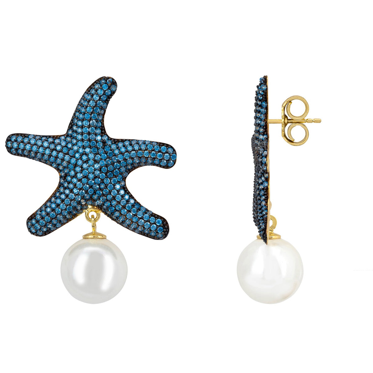 Starfish Pearl Drop Earrings Blue Topaz Cz Gold