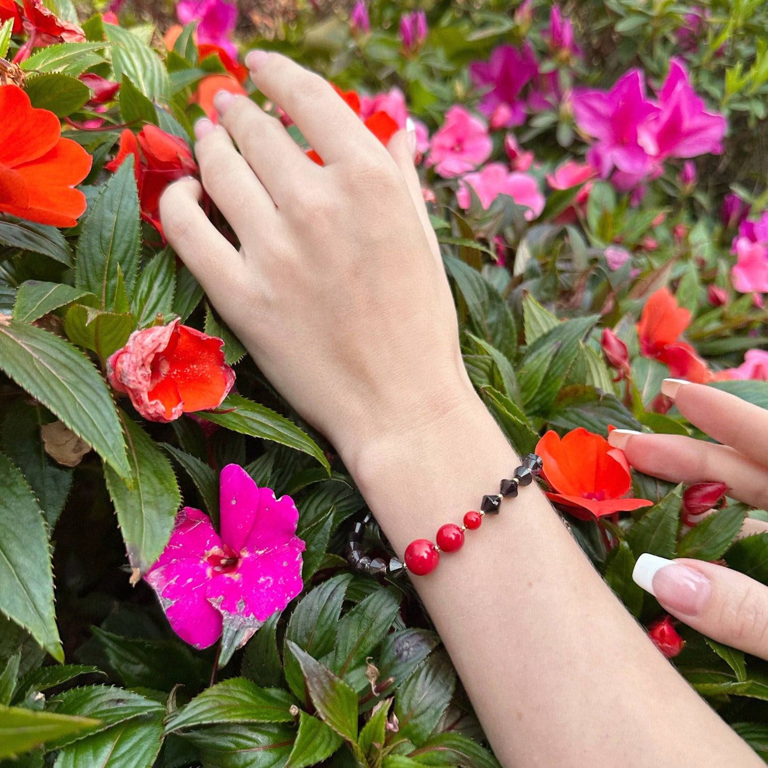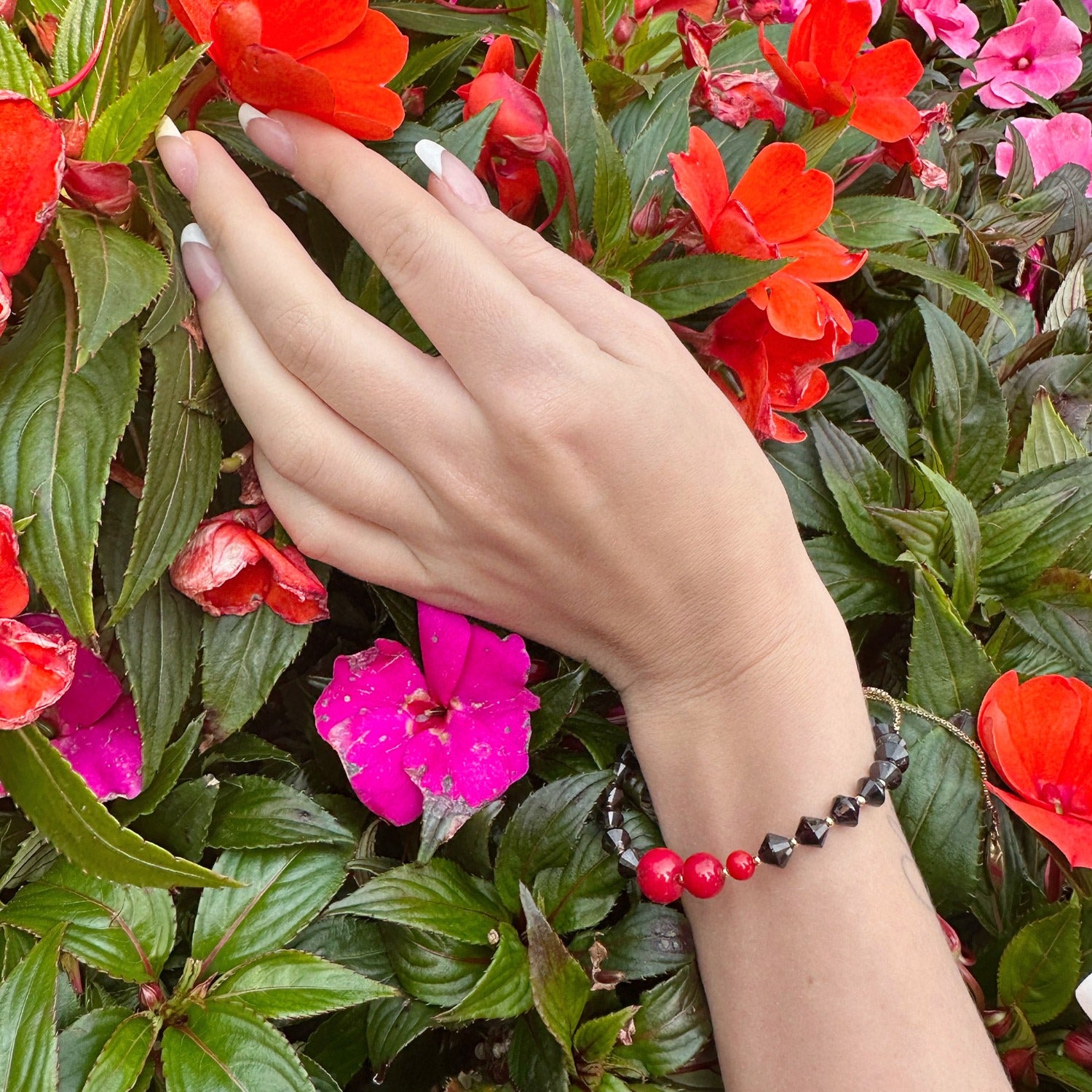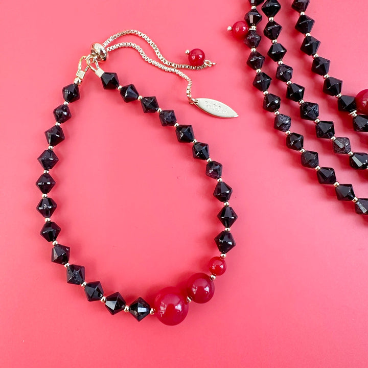 This adjustable bracelet is made with garnet gemstones and red bamboo coral beads. The specific material of the bracelet cord/chain is not mentioned.