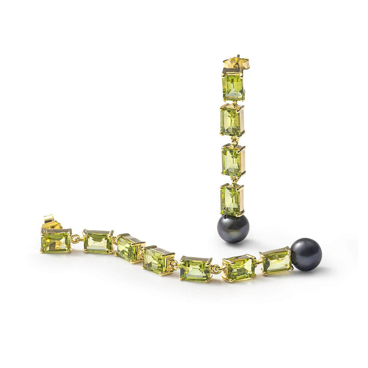 From German Kabirski's Buds and Beans Collection, these asymmetric earrings highlight the beauty of natural green gemstones in a modern design. Crafted from 925 Silver and fully plated in 18K Gold for a stylish and allergy-free finish, this unique pair features lines of octagon-cut (5x7 mm) apple-green Peridots. The design is completed with striking natural Black Pearls, adding a bold, organic contrast. Perfect for making a statement, these earrings ensure you stand out wherever you go.