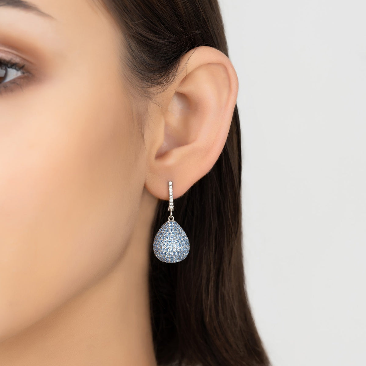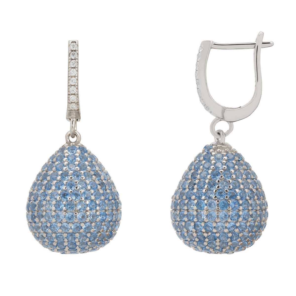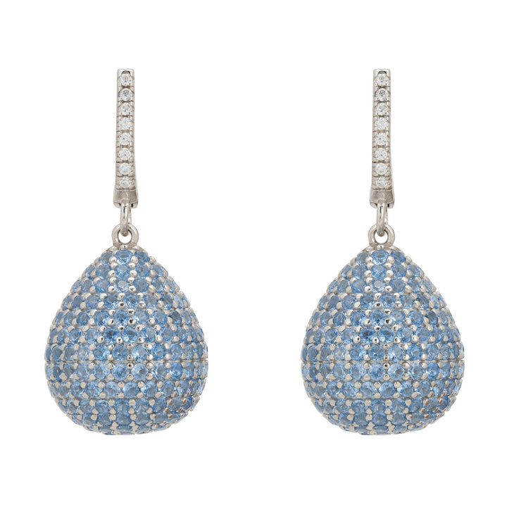 Designed as a brilliant-cut pear drop shaped orb, suspended from a zircon adorned creole fastening. These earrings feature an array of sparkling zirconia set in 925 sterling silver which add a striking pop of colour. The vast amount of zirconia make these earrings hypnotic with their dazzling effect as they catch the light from day to night. With a 'little something blue', makes for the perfect bridal jewellery. Ideal for those who covet statement jewellery, pair with a little black dress or elegant cocktail attire. These earrings make an impact but are comfortable to wear. Pierced earrings with creole fastening.