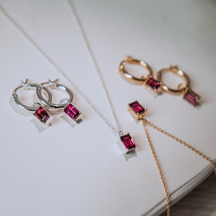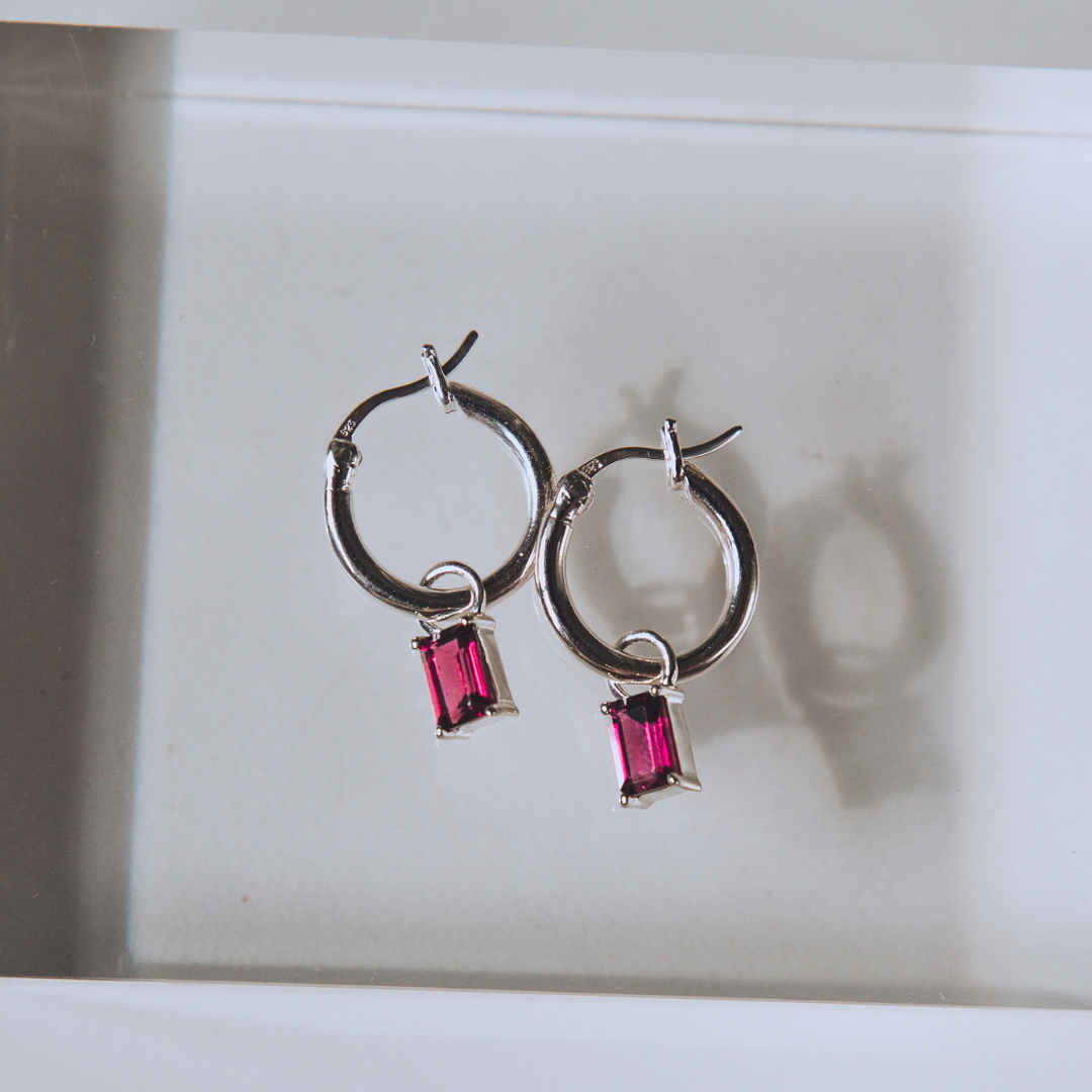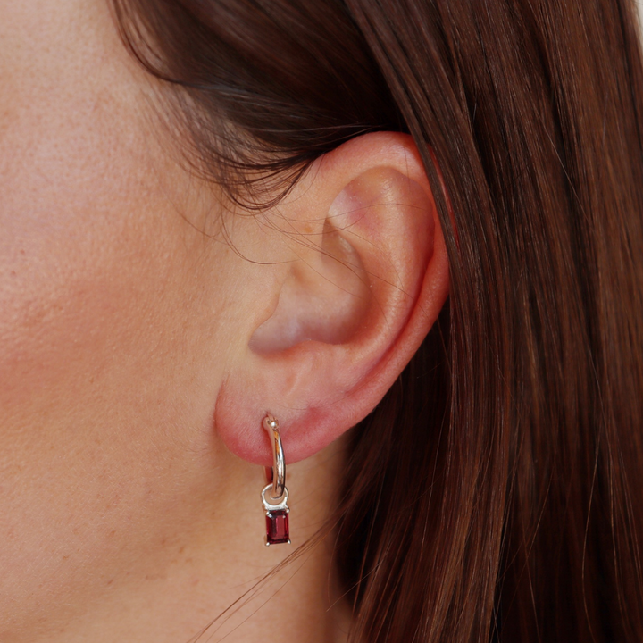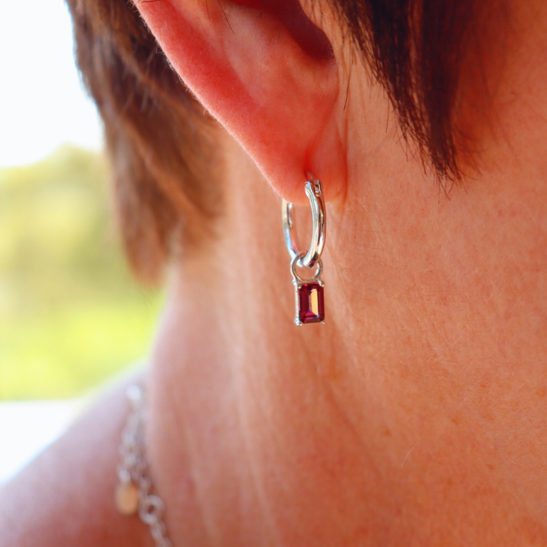 Warm, red, rhodolite garnet. Featuring a rectangle cut of the beautiful rhodolite garnet, the semi-precious stone hangs from each of the small sterling silver hoop earrings. The vibrant red colour within the rhodolite garnet stone is all things classy and beautiful. The hoop earring is a 15mm sterling silver hoop.