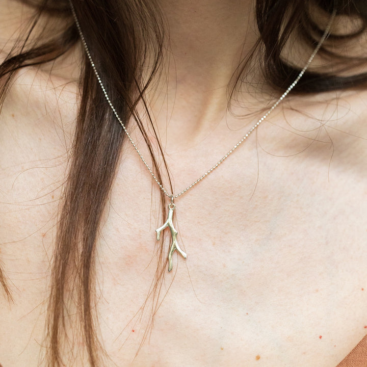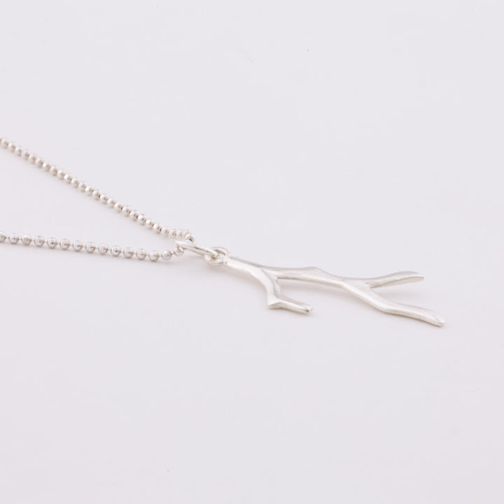 This necklace is handcrafted from recycled sterling silver. It features a chain with a balls design and a coral-shaped pendant. It is a single necklace.