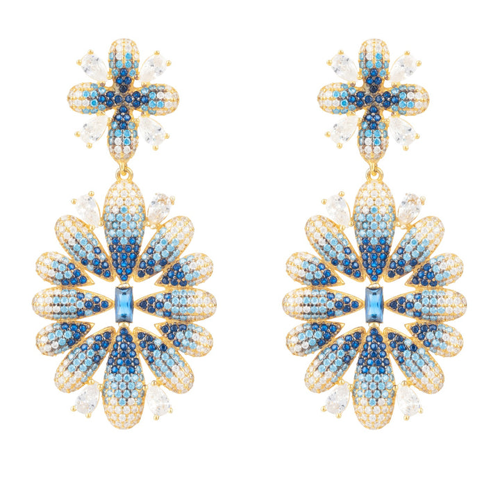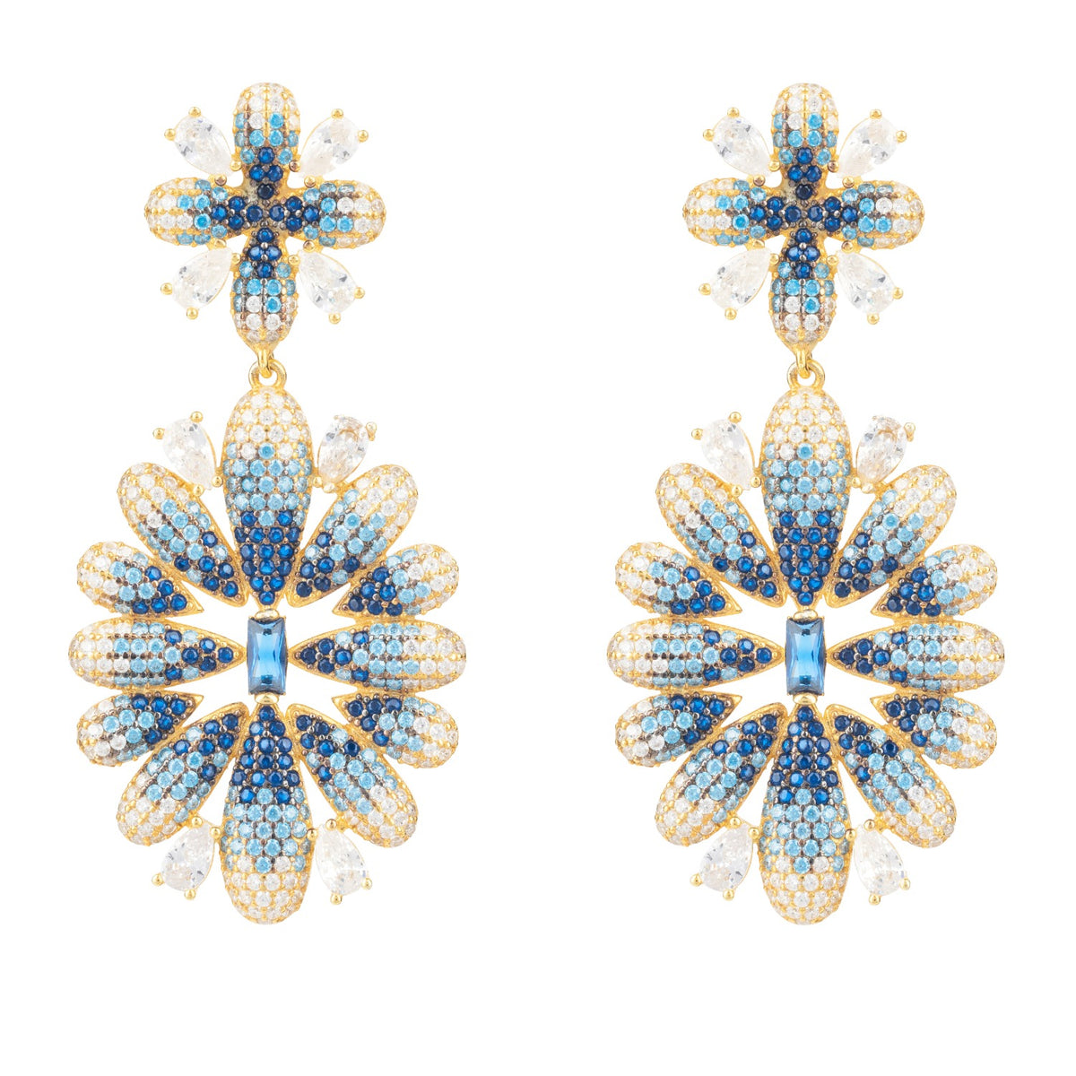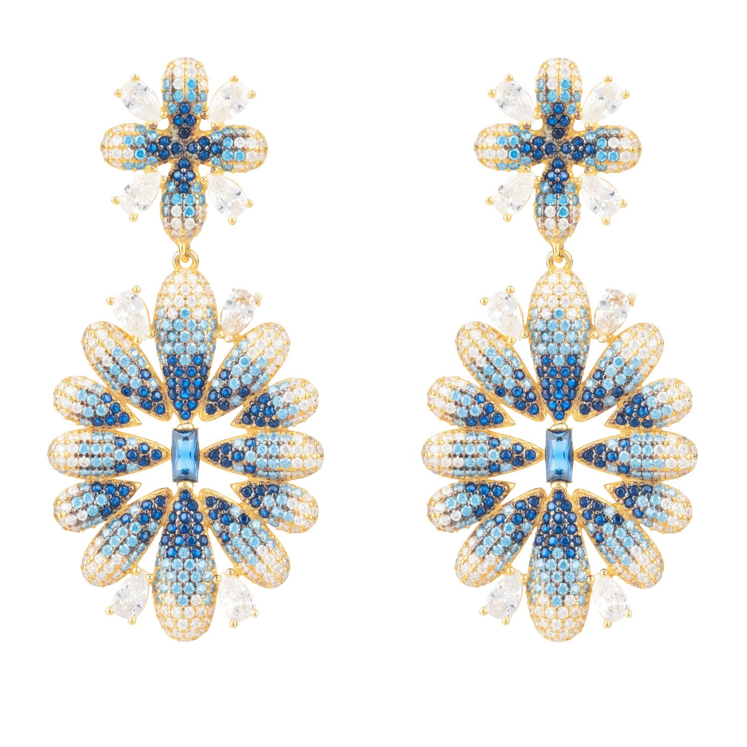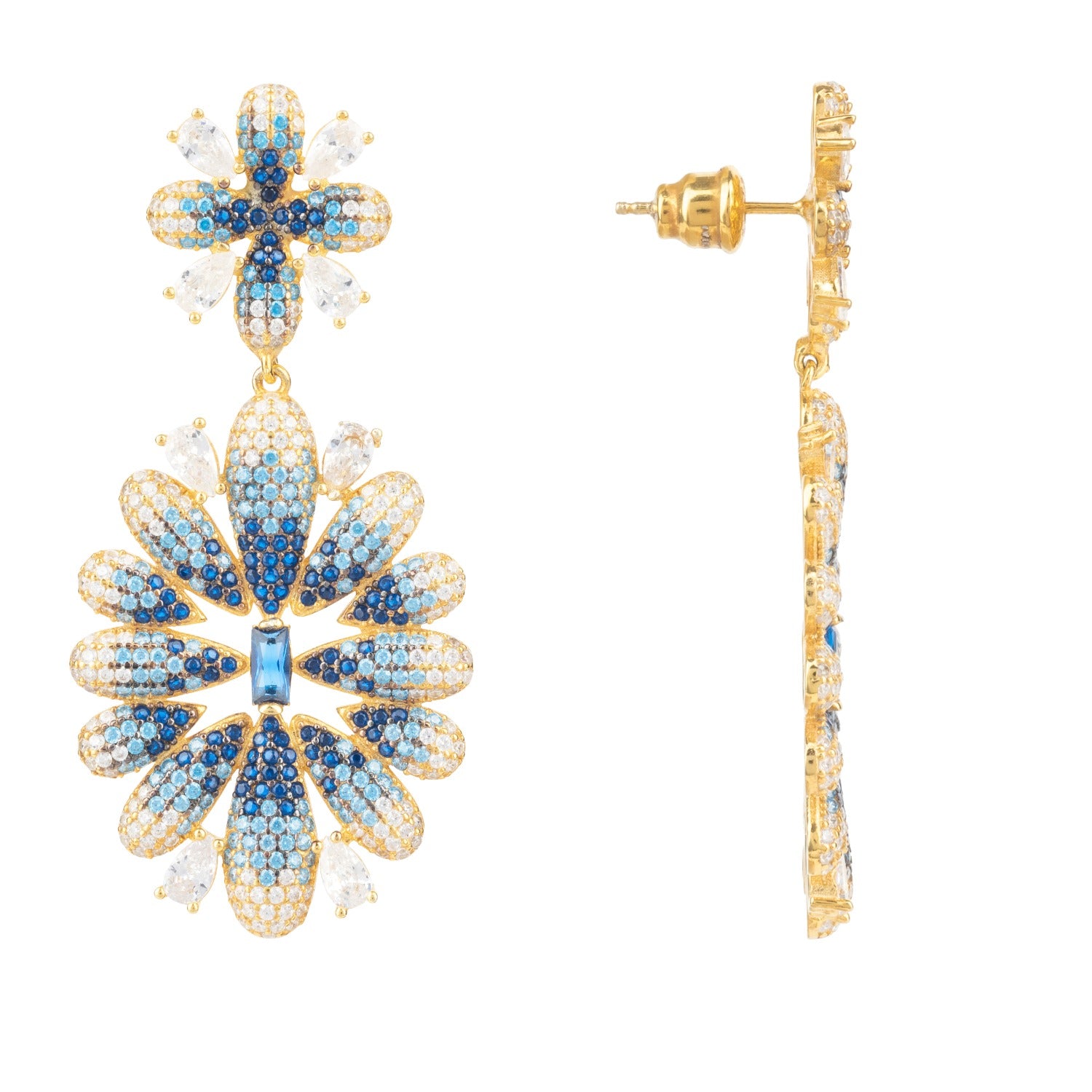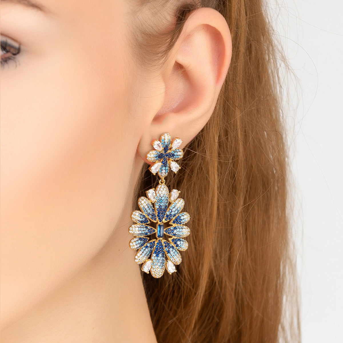 Spectacular statement earrings with incredible detailing and beautiful colours. Inspired by the fabled gardens of Babylon, these stunning earrings dazzle with the luxurious hues of deep sapphire blue, pale blue and white zircons and gemstones, beautifully set within an elongated flower shaped design with a sapphire blue gemstone at its centre, suspended from a smaller gem encrusted flower design top. Lightweight, yet still a major statement. Perfect for those who like statement jewellery, this earring is a great finishing touch to any bridal, evening or cocktail party outfit. Pierced earring with stud fastening.