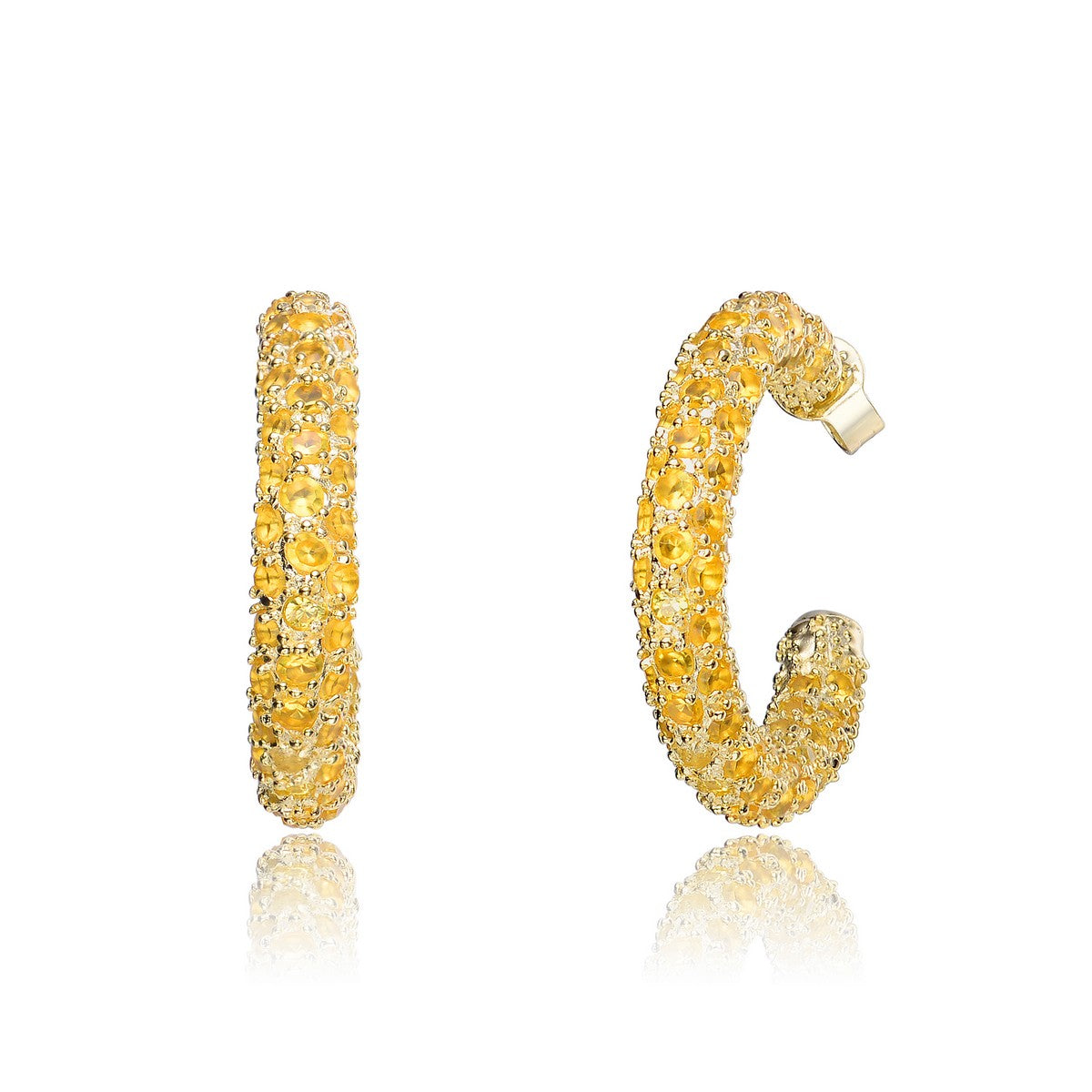 Stylish .925 Sterling silver gold plated yellow cubic zirconia pave hoop earrings. Encrusted with yellow cubic zirconia stones these classic hoop earrings offer a new spin. Crafted of .925 Sterling silver with gold plating and secure with butterfly closure. These earrings are appropriate for both day and night looks.