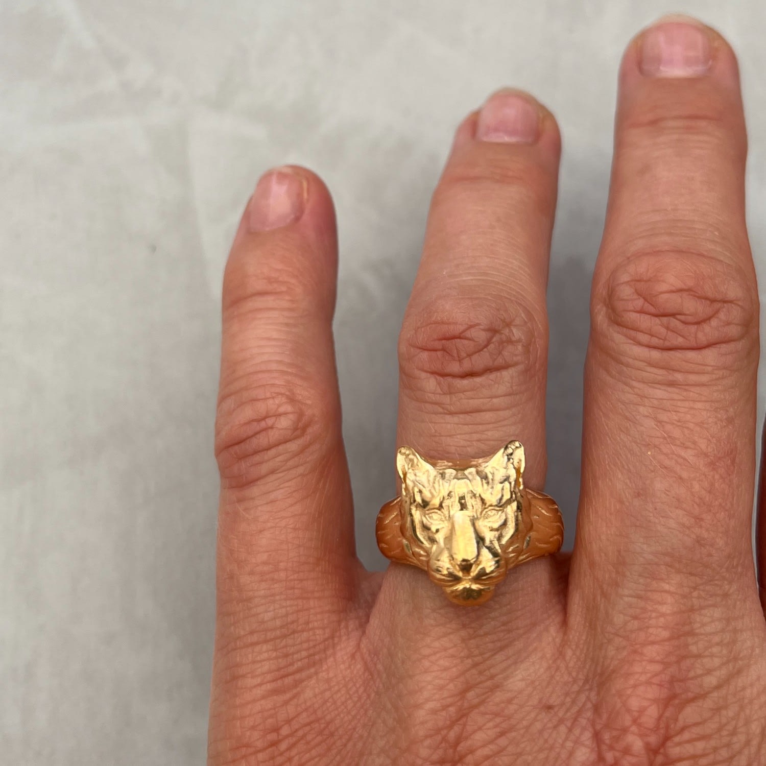 This ring is handmade from recycled 925 sterling silver and features a tigress head design. It is available in US ring sizes 5-8.