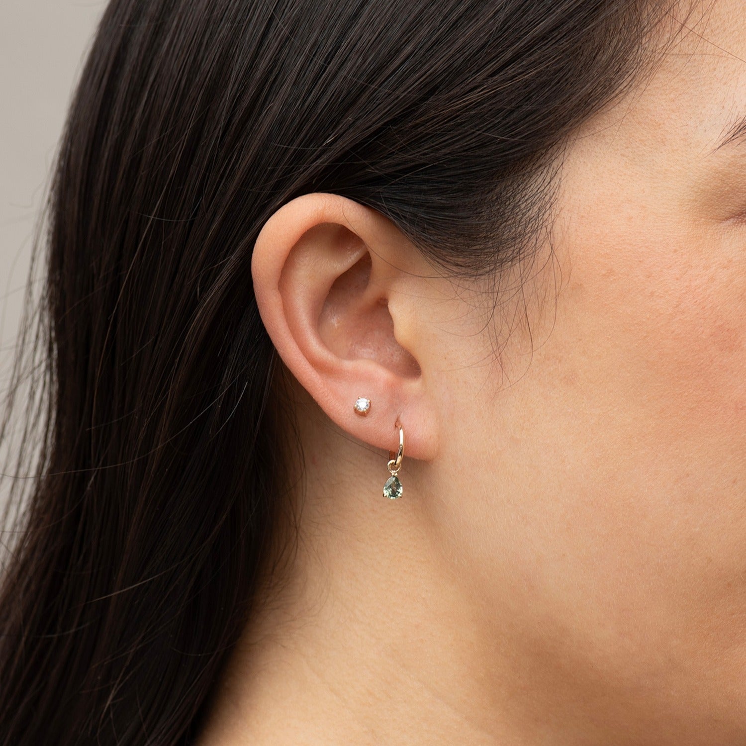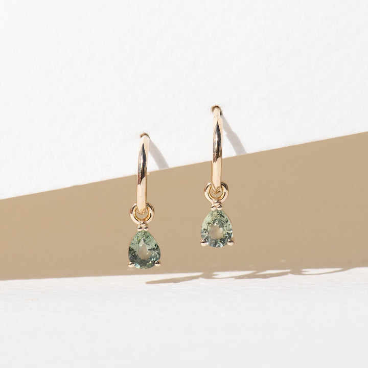 The Dew Drop Hoop shimmers like the morning dew, inspired by the fresh crisp mornings of spring. Let these earrings shine on their own or stack them to create a unique look. These simple and delicate hoops feature petite pear cut green Sapphires hanging from a 9k Yellow Gold hoop, secured with a butterfly. Green sapphires represent tranquillity and calmness. It's often believed those who wear a green Sapphire encourage love, thoughtfulness, and peace.