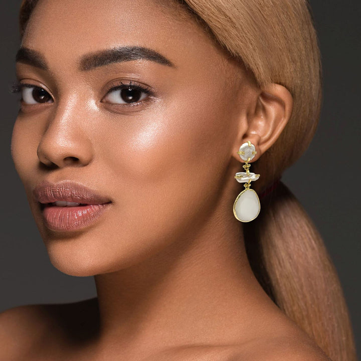 Freshwater pearl and white cat's eye drops set in gold plated brass