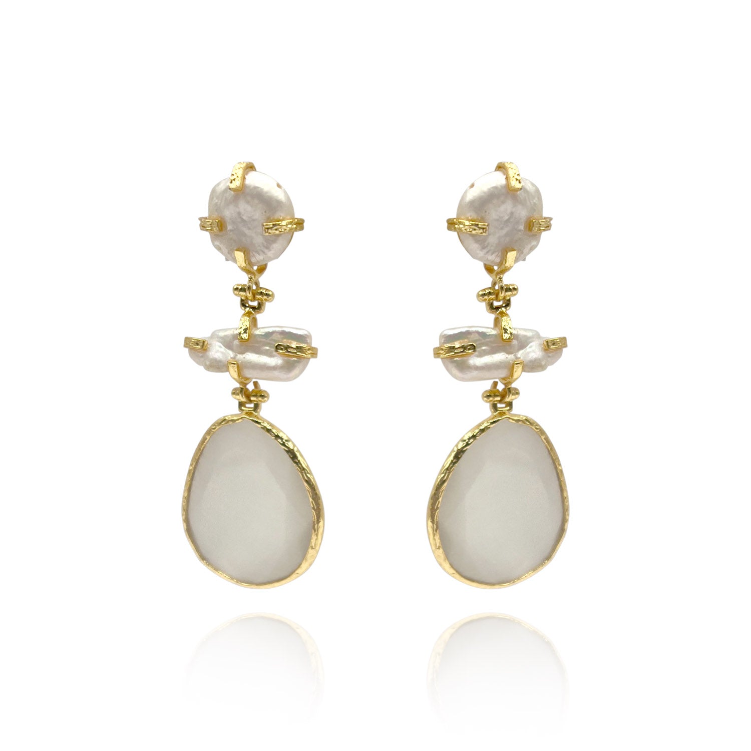 Gold Plated Brass Drop Earrings With Freshwater Pearls And Large White Cat's Eye