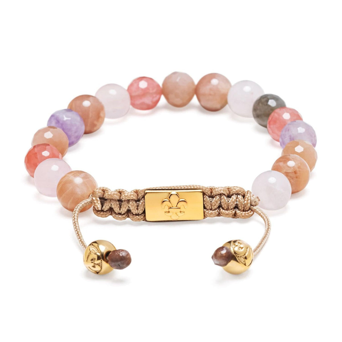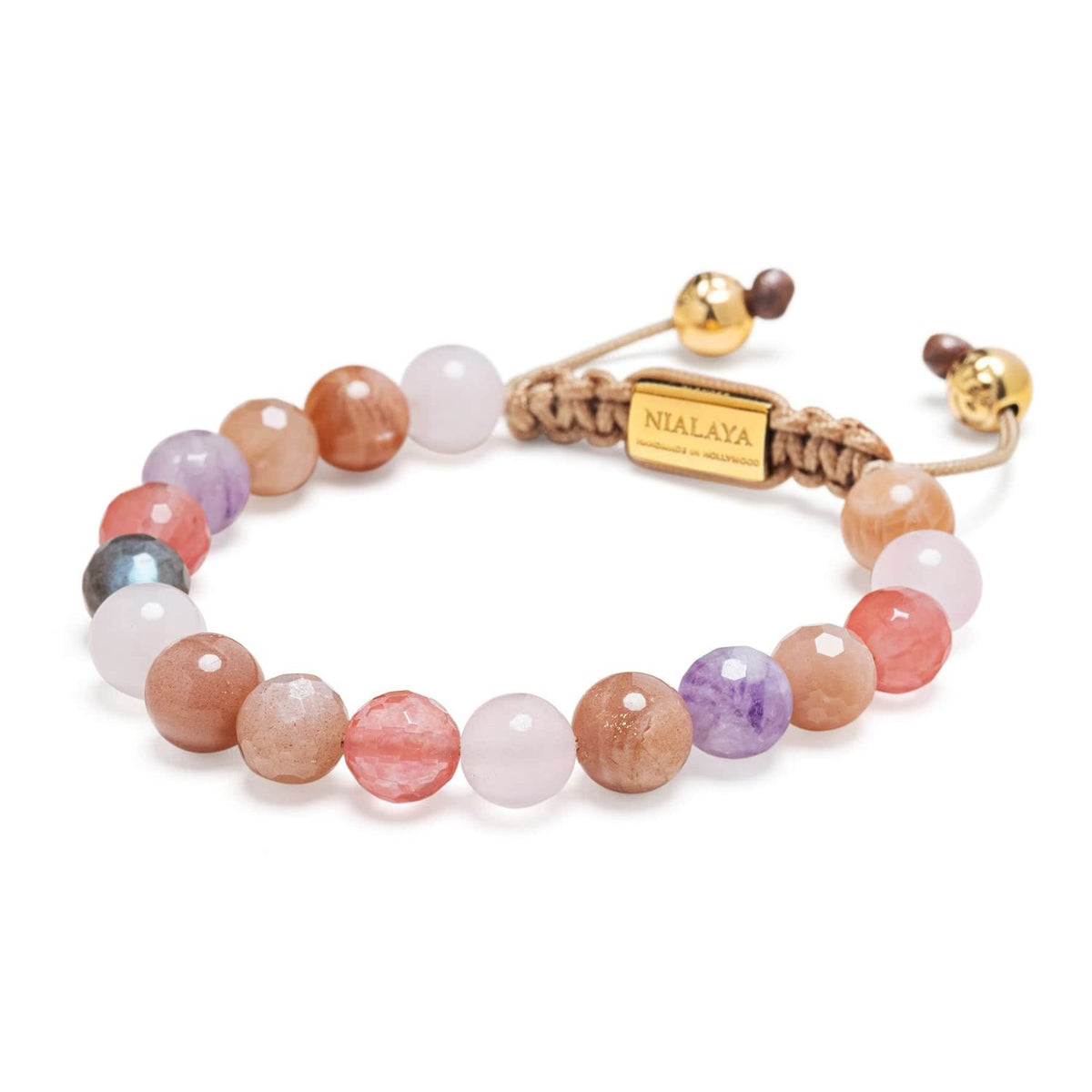 This beaded bracelet features 8mm beads of Cherry Quartz, Rose Quartz, Amethyst Lavender, and Pink Aventurine. It is handcrafted with a 100% nylon string and finished with a gold-plated stainless steel drawstring lock.