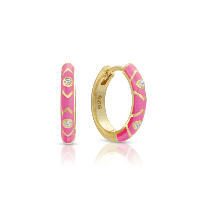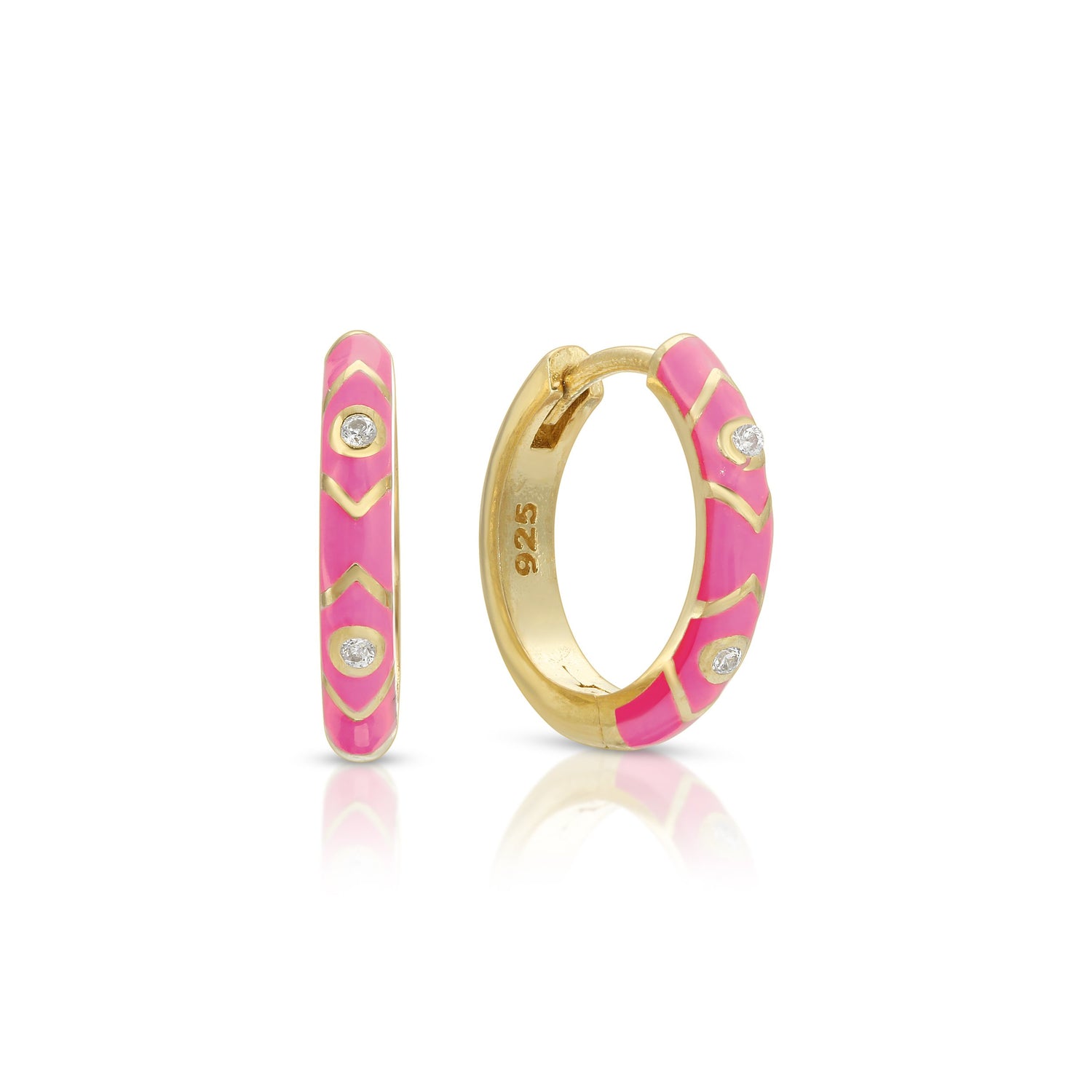 Put your vibrant personality on full display with these enamel-colored huggie earrings. Featuring a colored enamel finish on gold vermeil, these earrings add a splash of color to your everyday look. The irresistibly playful design is finished with Cubic Zirconia Stones, sparkling your outfits in style. 925 Sterling Silver Jewelry is known for its amazing shine! Our Jewels are dipped it 14K gold to give you it that extra gloss !