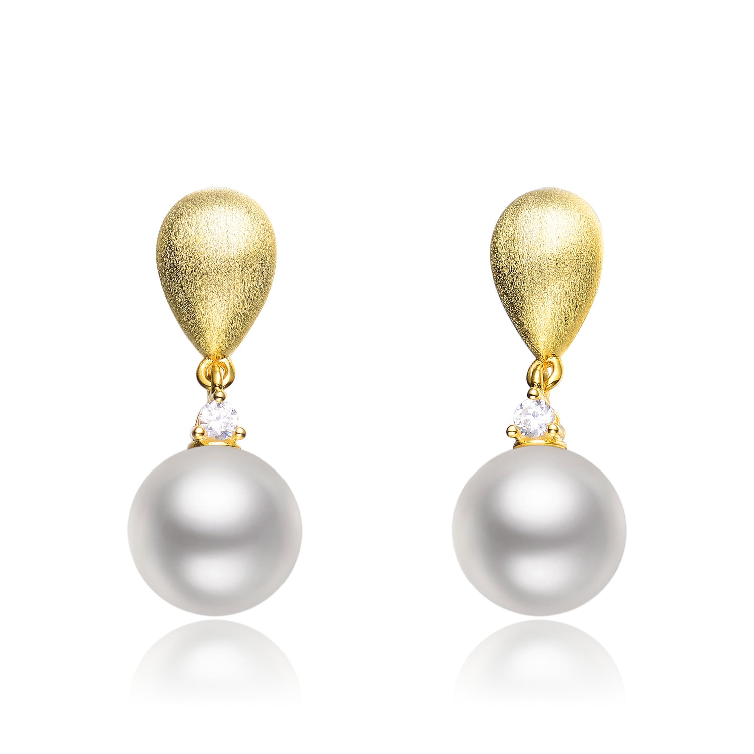 Cubic Zirconia Sterling Silver Brushed Gold Plated Pearl Drop Earrings