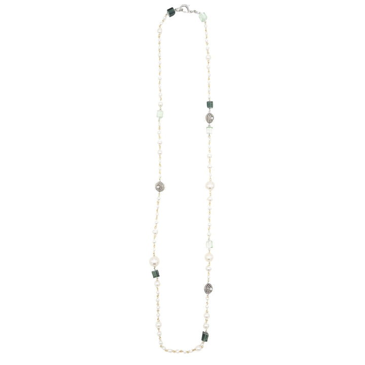 This Sastreria Necklace - Green by Sita Nevado is a long, flowing design that exudes elegance and refined charm. Pearl-like beads with luminous crystal cores are artfully paired with square crystal elements, hand-set with brass wire for durability and beauty. Its generous length allows for versatile styling—worn long, doubled, or layered. A sophisticated statement piece with subtle sparkle.