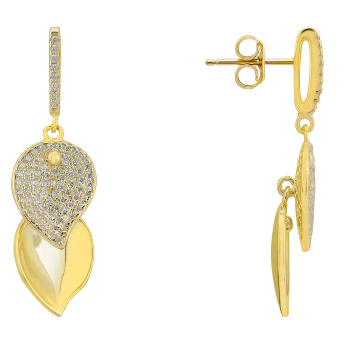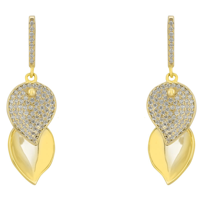 Introducing the Dual Petal Sleek Drop Earrings in Gold – a true masterpiece that embodies elegance and sophistication. The design is a poetic homage to the natural beauty of petals, featuring two delicate petals arranged one beneath the other. Each petal moves independently, creating a mesmerizing dance with every turn of the head. The earring top and the upper petal are beautifully adorned with sparkling cubic zirconia, adding a touch of glamour and sophistication. In contrast, the lower petal boasts a highly polished sheen that reflects light in the most enchanting way.