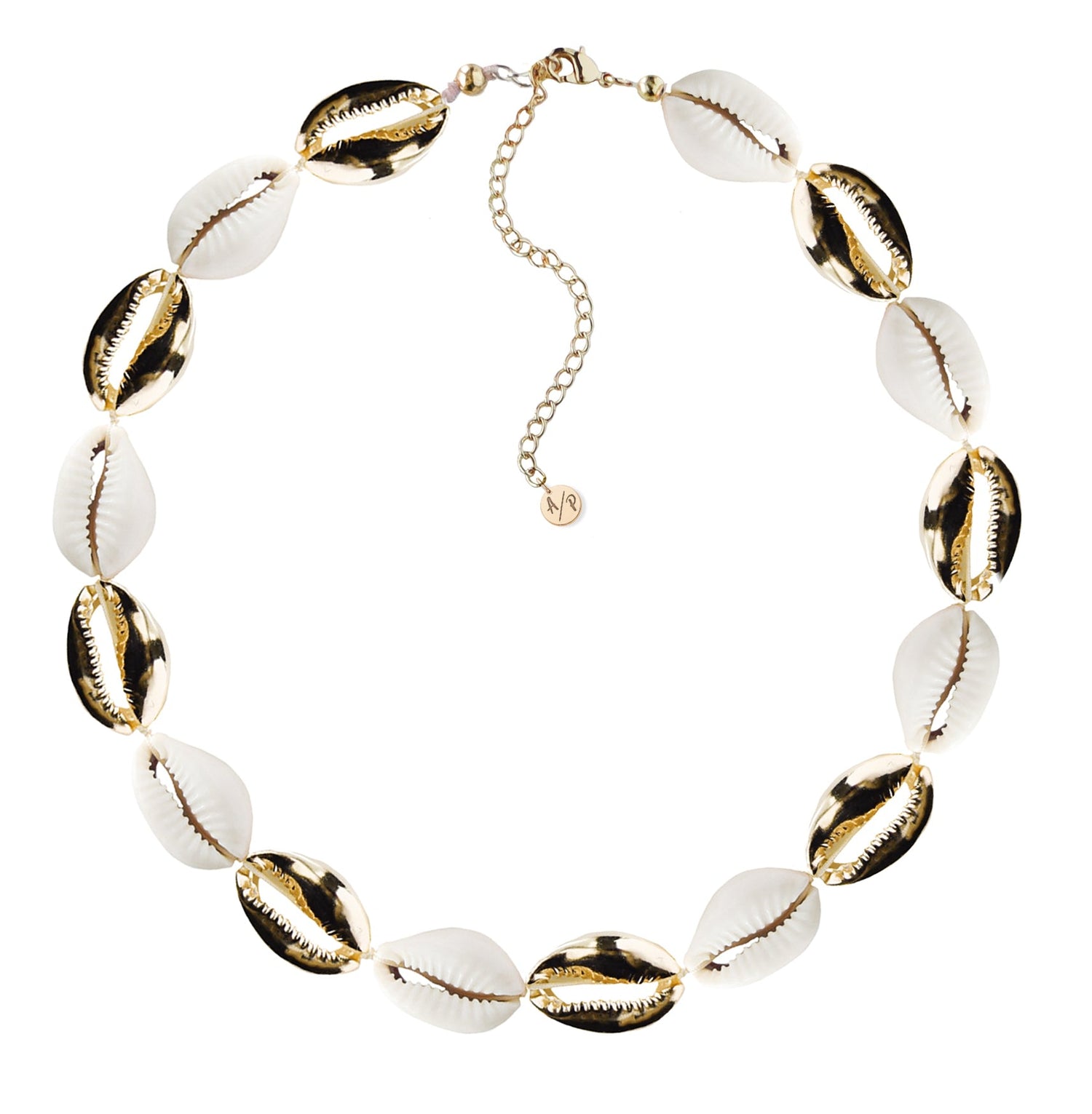 This choker features a mix of natural shells with 14k gold-plated, 14k rose gold-plated, and 14k gold-filled brass metal accents. It is approximately 12.25 inches with a 3-inch extender.