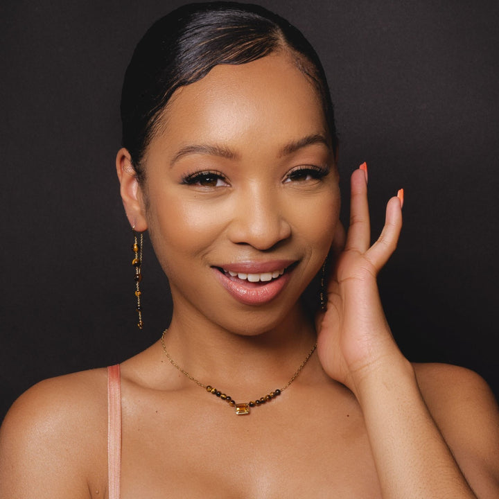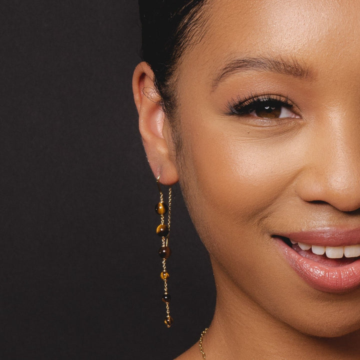 Sparkle and shine wearing these beautiful 18ct gold plated 925 sterling silver dangle drop earrings. Complete with mysterious tiger's eye gemstones in a unique beaded design that swing elegantly from the ear. A must have in your jewellery collection.