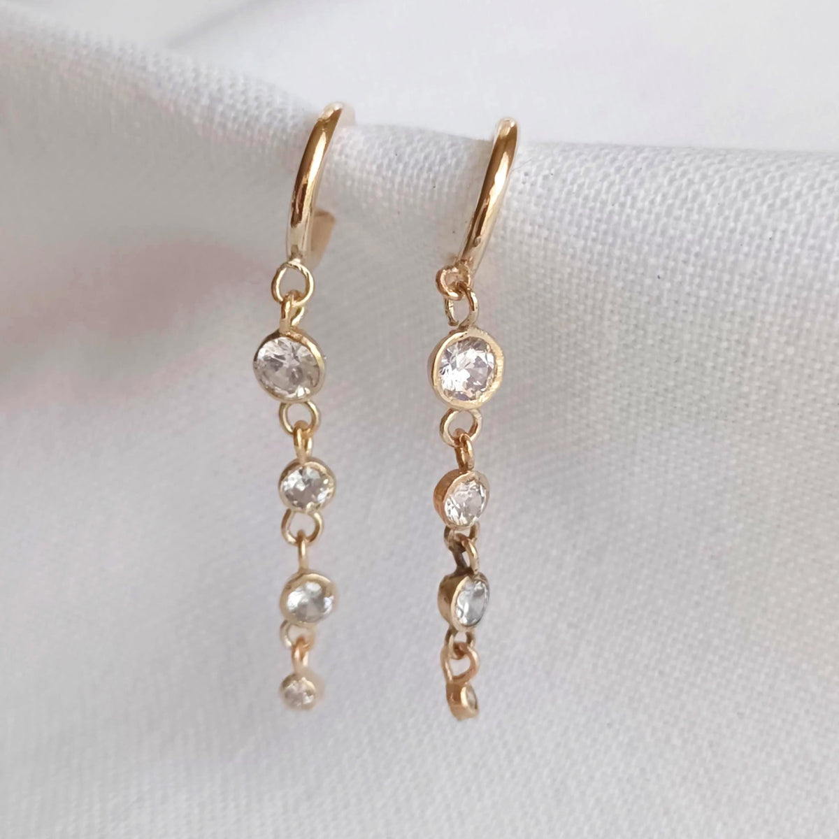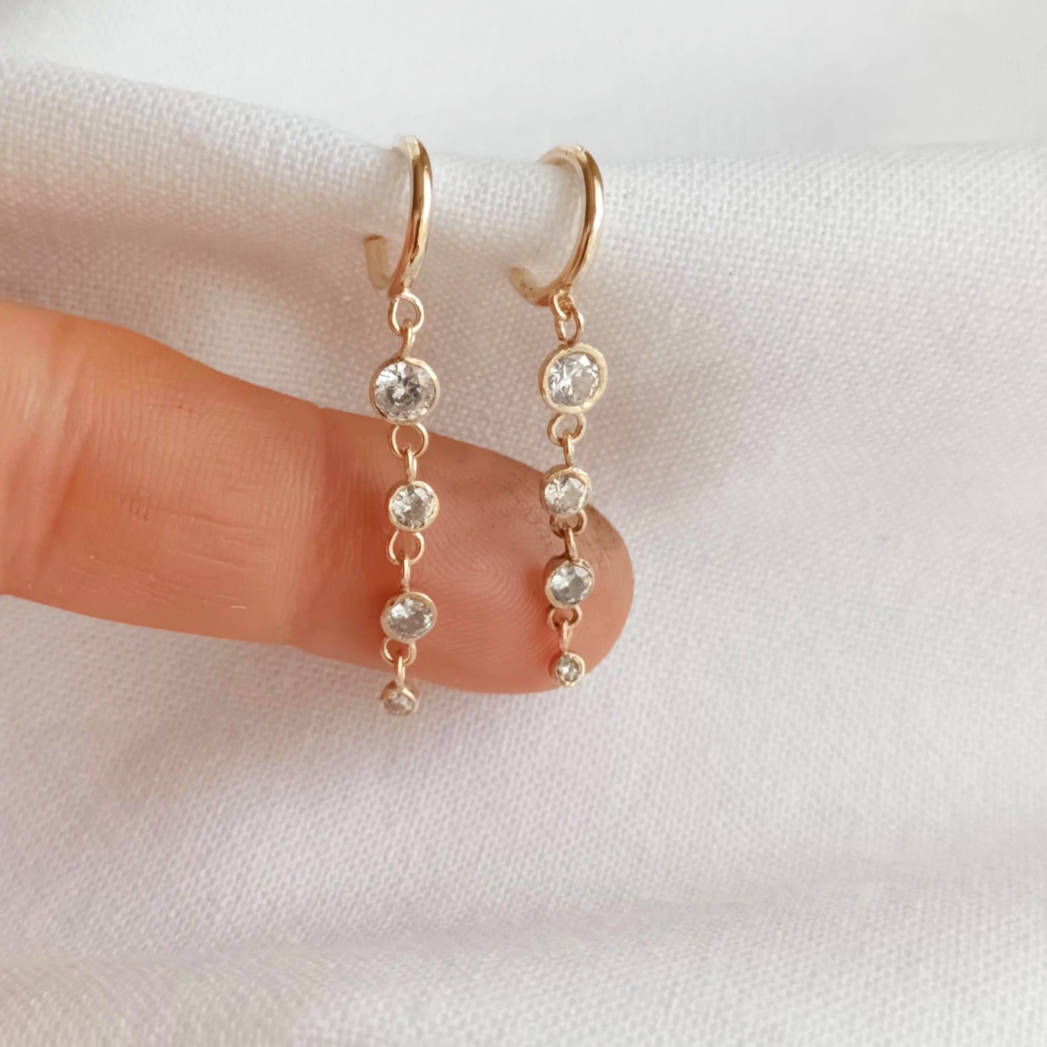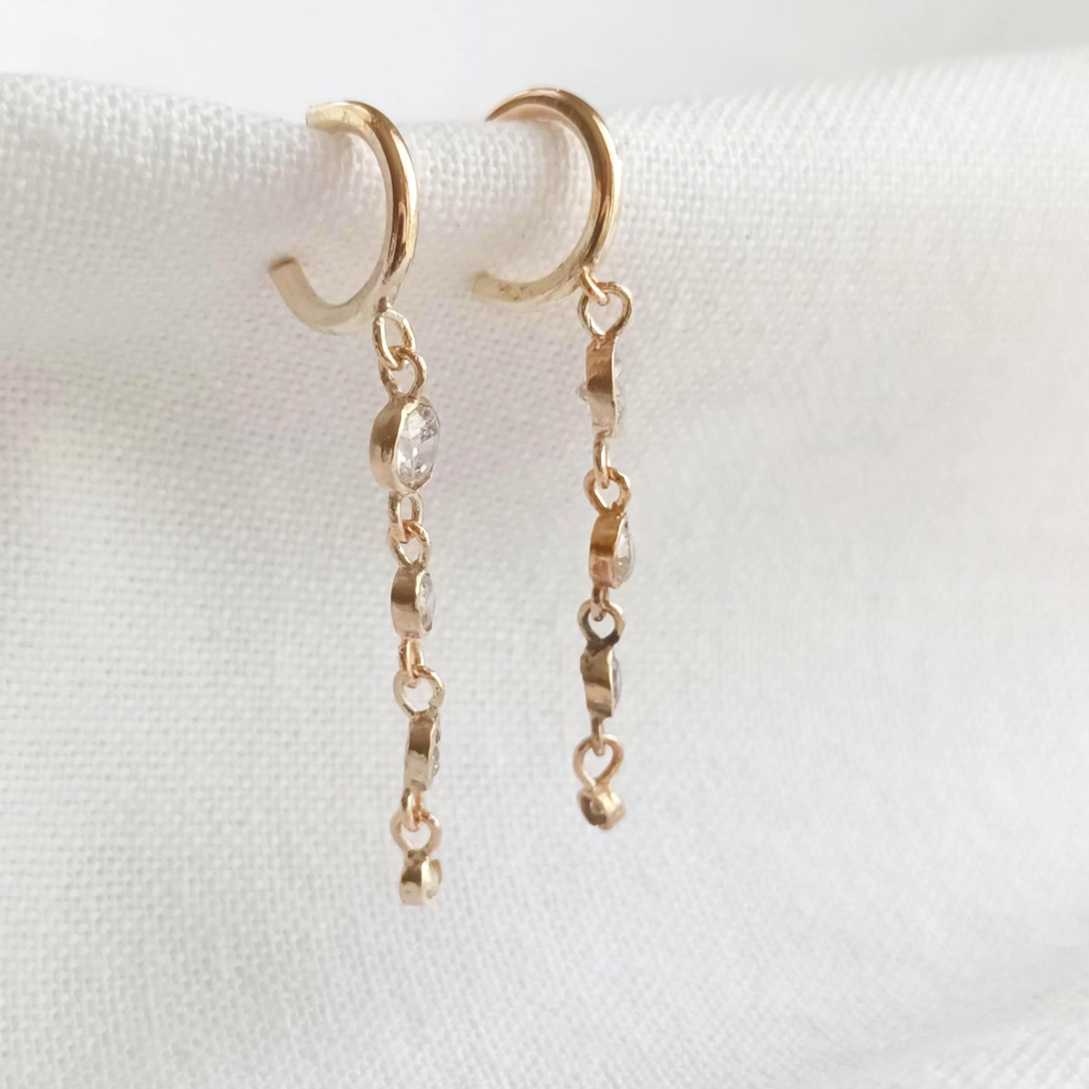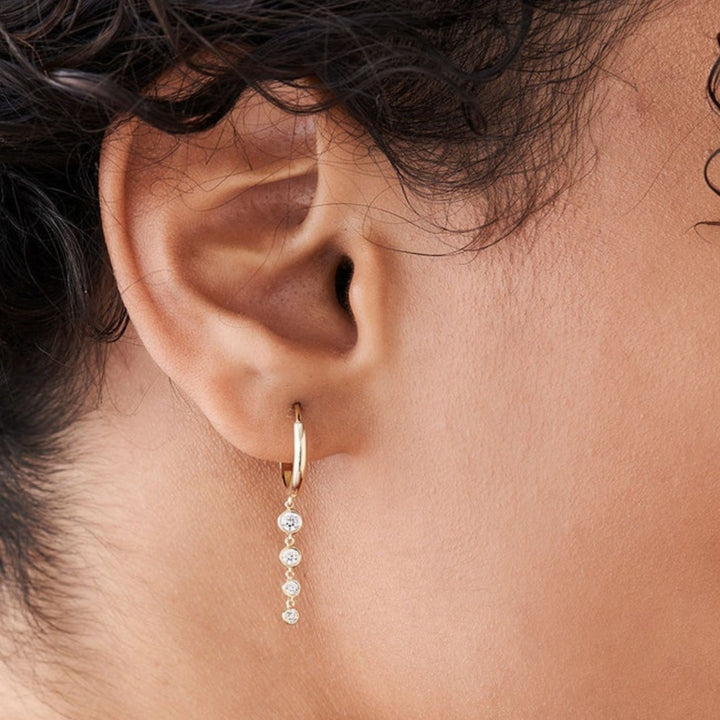Stunning diamond hoop earrings with 3 diamond drop, these beautiful solitaire stud earrings are a unique take on a classic design. Balanced within a minimal gold rim, Diamond Earrings combine subtle sparkle with symmetrical structure. Our signature knife-edge bezel setting bounces light in every direction so your diamonds always shine bright. Diamond Stud Earrings are a super sparkly way to create your everyday style. Simple, sleek but no less dazzling, these beautiful earrings are perfect for everyday wear and can be teamed up with all manner of different jewellery styles.