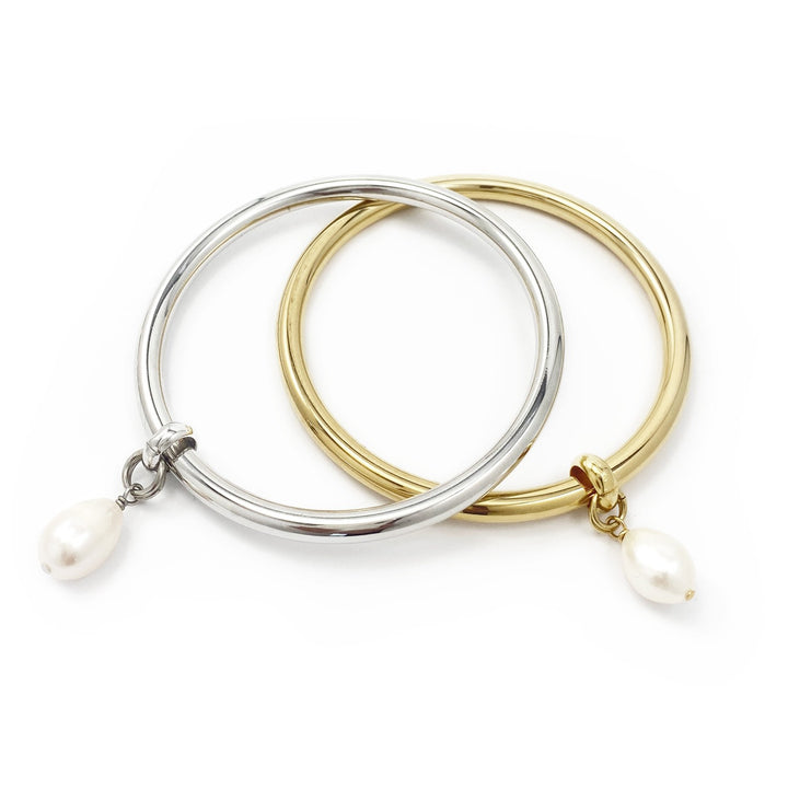 This bangle is a solid, hand-polished piece crafted from 14k gold plating over brass and features a natural freshwater pearl drop. It is hypoallergenic.