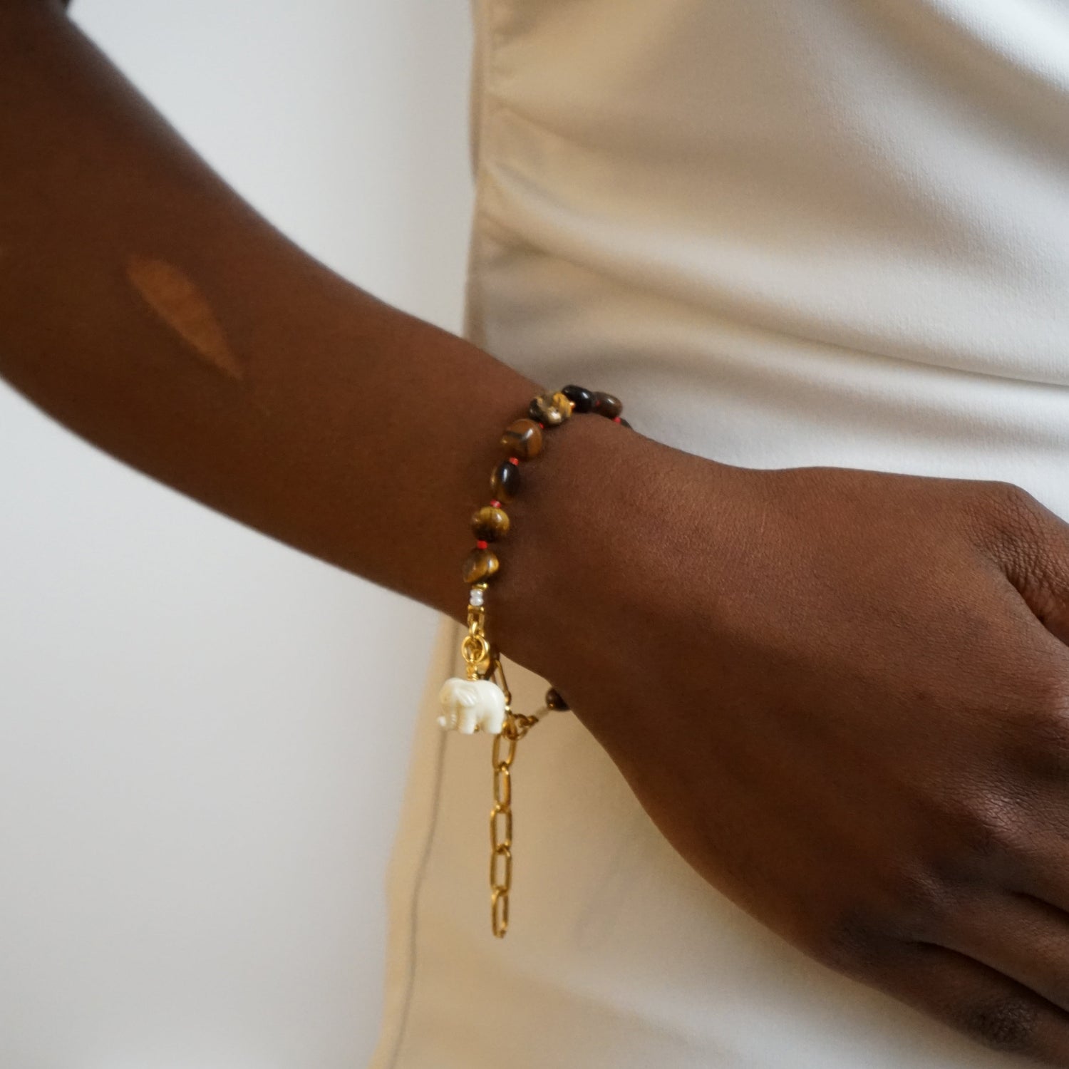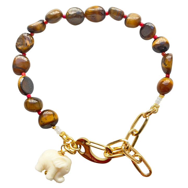 This bracelet is handmade in Germany and features one-of-a-kind tiger eye gemstones, a carved elephant gemstone, and gold-plated stainless steel.