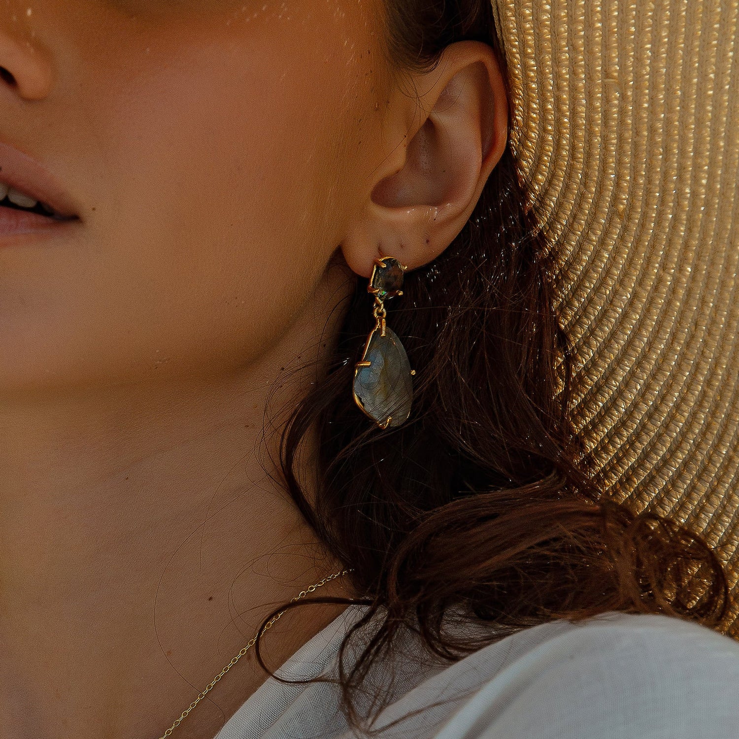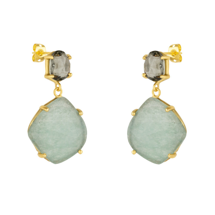 These drop earrings feature a naturally unique Eau de Nil gemstone set in a gold finish.