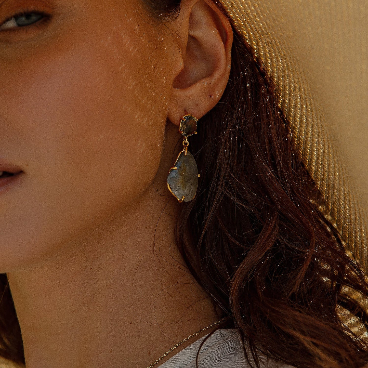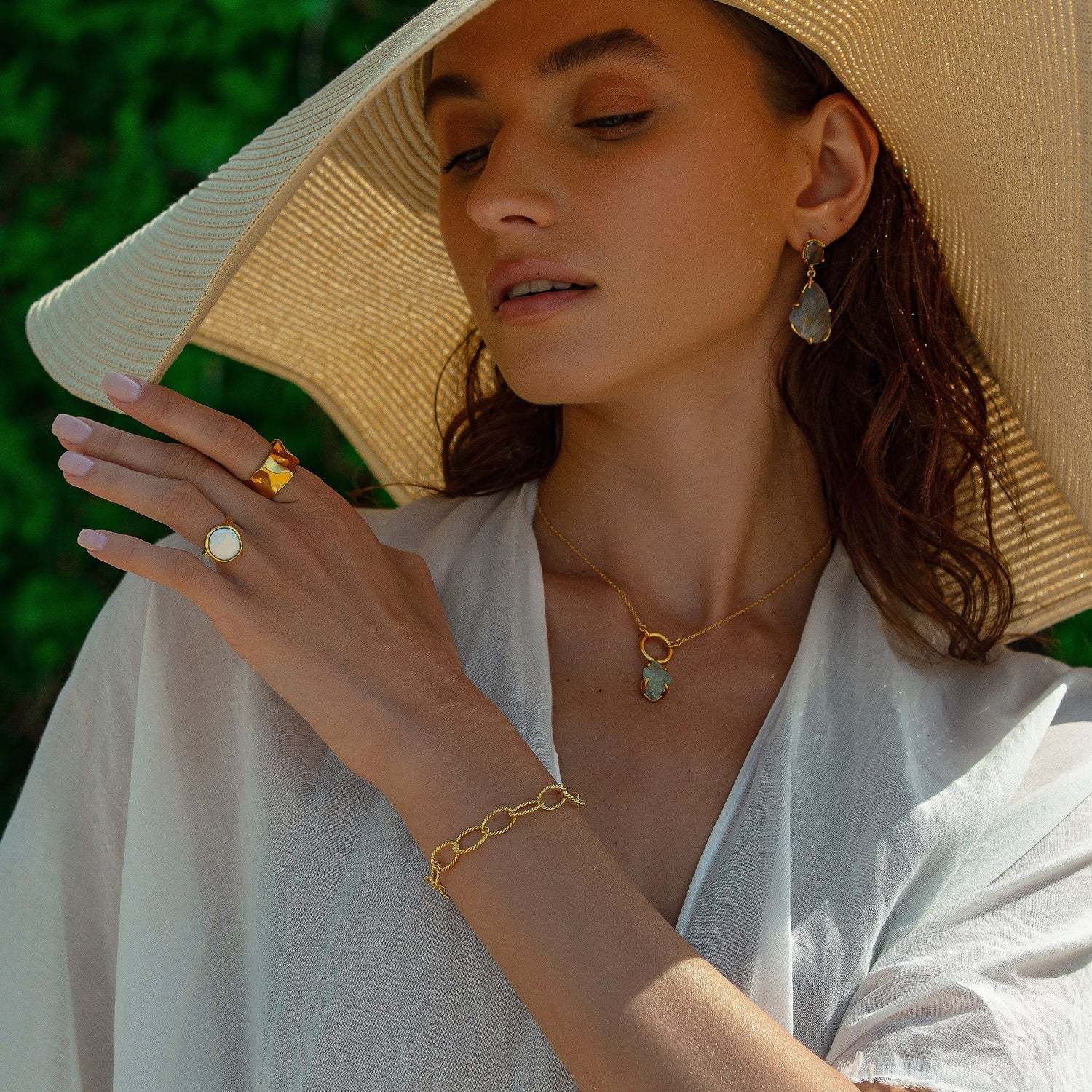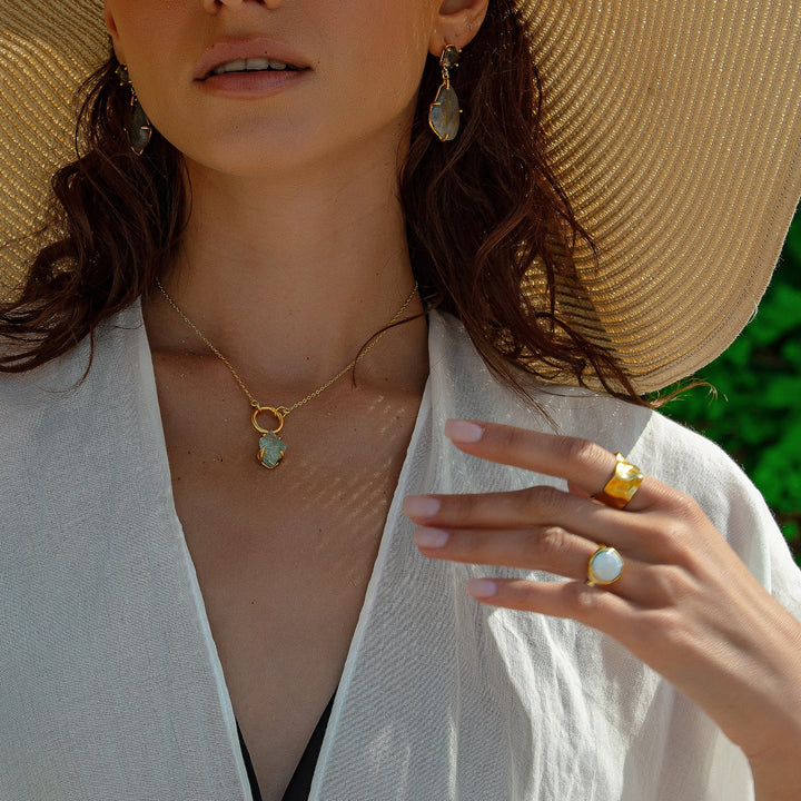 These Drop Eau De Nil Gemstone Gold Earrings by Mejoma are a beautiful and unique accessory that celebrates the imperfect beauty of natural gemstones. Each stunning Eau de Nil gemstone is naturally one-of-a-kind, with unique irregularities that make them truly special. These earrings are a perfect statement piece that adds a touch of individuality and artistic elegance to any look.