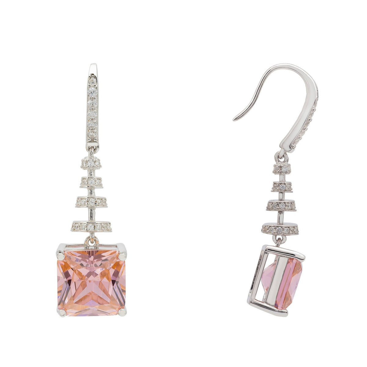 Spiral Square Crystal Drop Earrings Morganite Pink Silver
