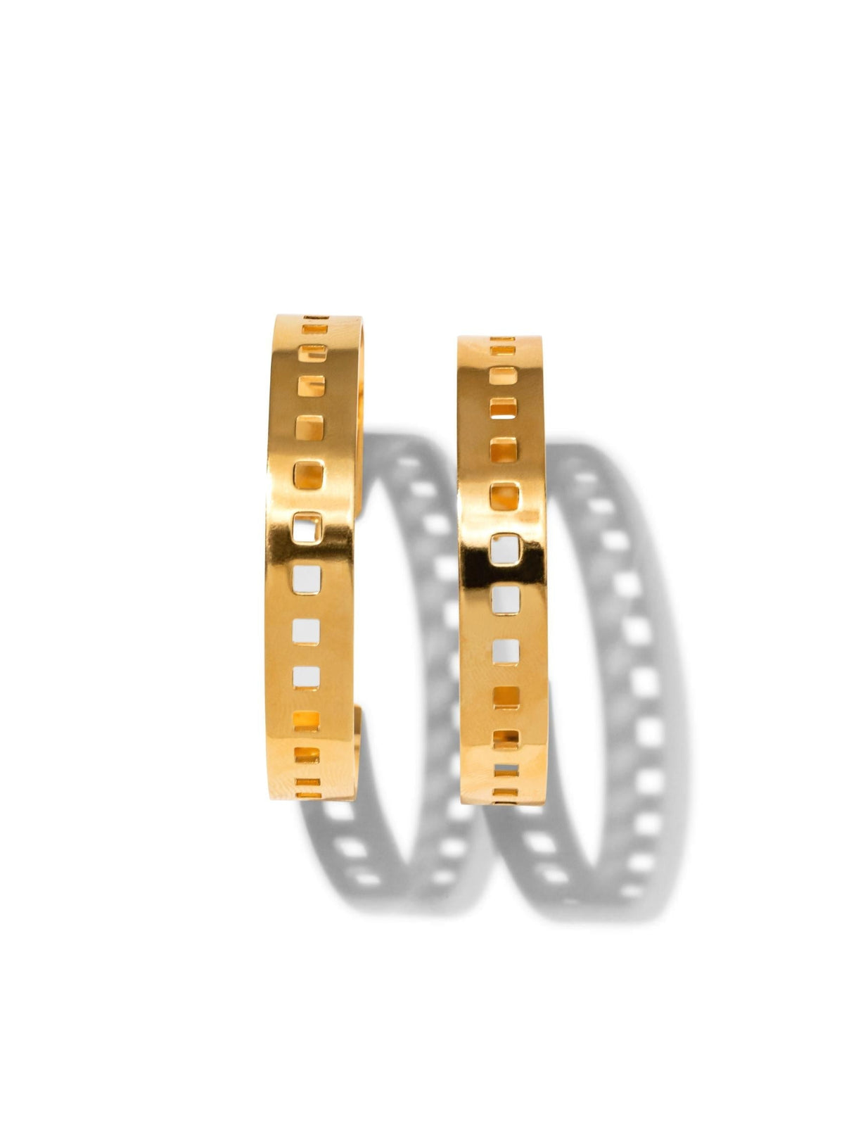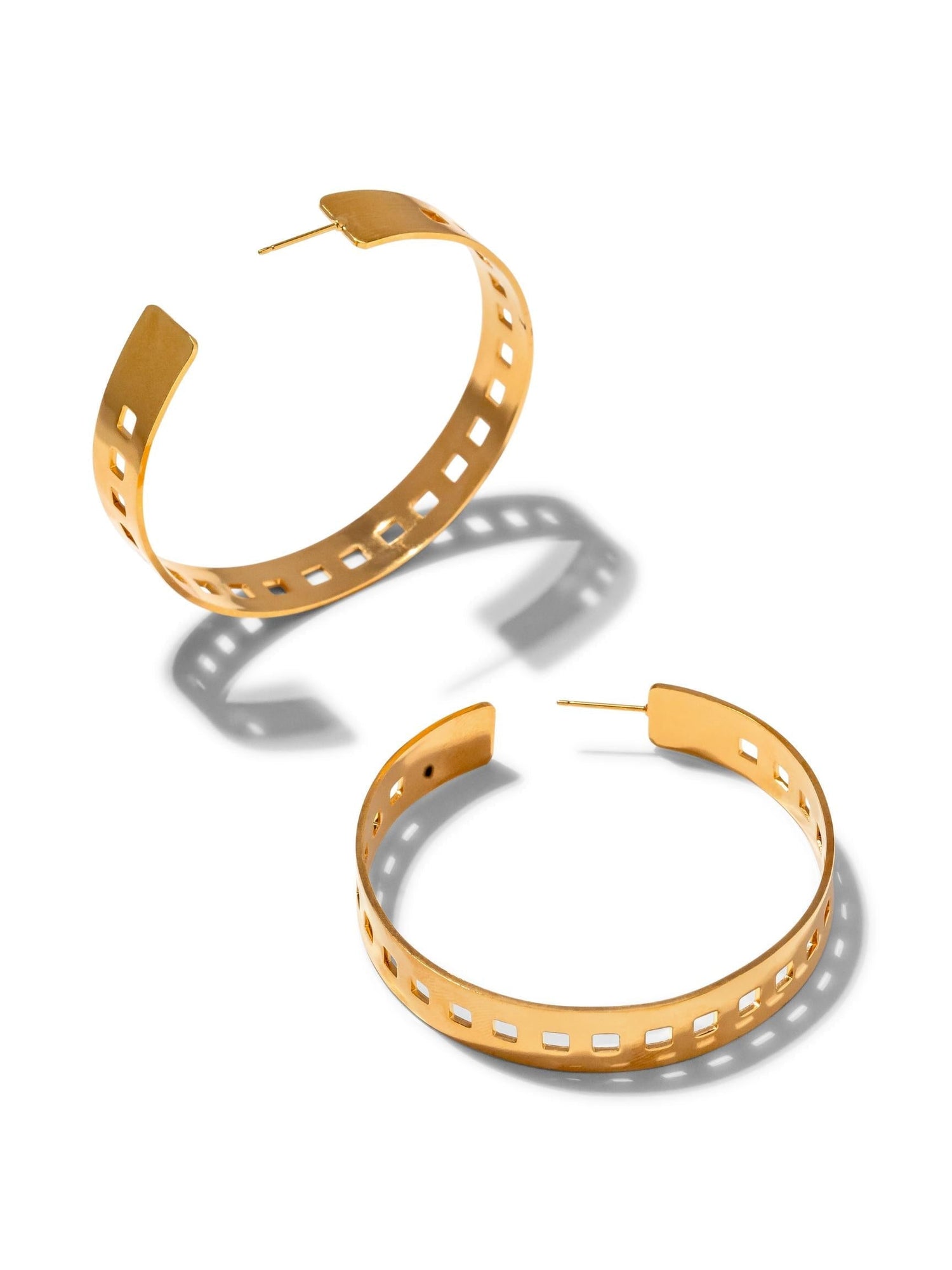 These Girls On Film Hoop Post Earrings by Jaredjamin are a stunning homage to the Golden Era of Hollywood. The sleek, rolling liquid-gold design is inspired by the movement of film, creating a classic hoop with a modern twist. These hoops are perfect for making a stylish statement and adding a touch of glamorous, timeless elegance to any look.