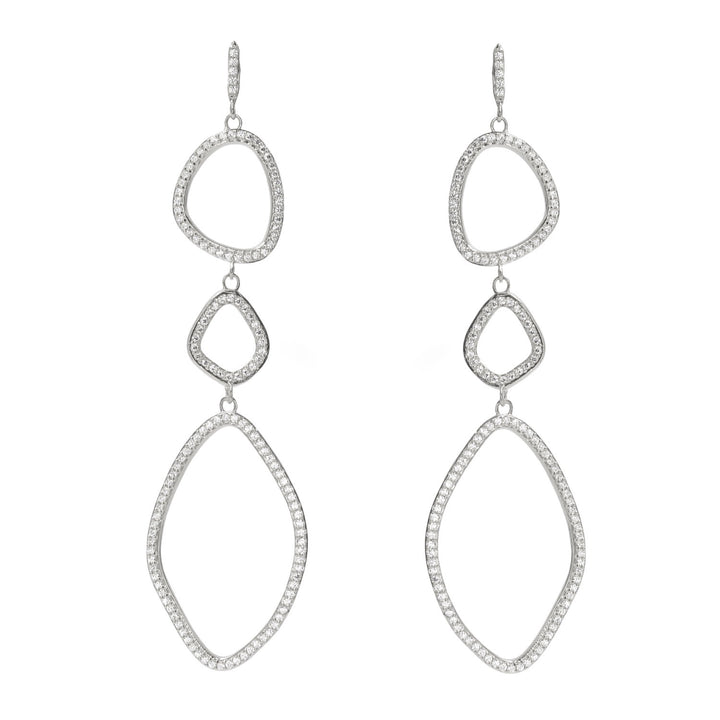 The Triple Organic Shape Dangle Earrings - Silver by Kamaria are a stunning and versatile accessory. They feature three organic shapes that dangle with a whimsical, three-dimensional effect. Set in Sterling Silver with high-quality crystal pavé, these earrings are sure to shine. They are perfect for dressing up for an evening out or pairing with a favorite pair of jeans.
