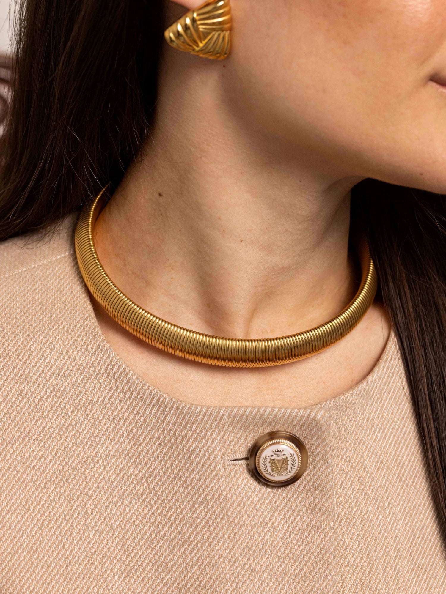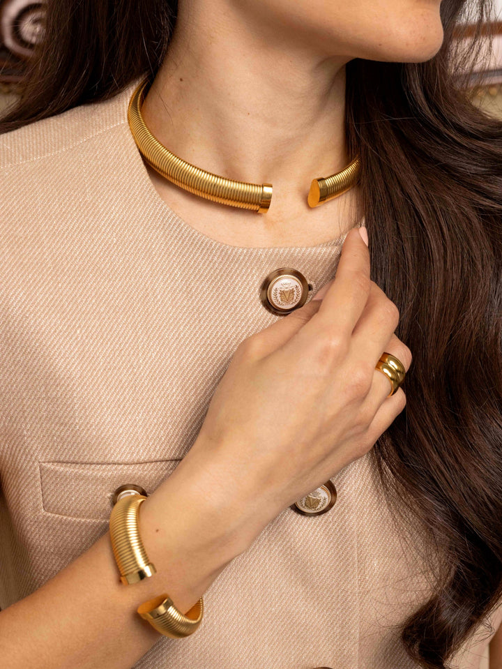 Where classic meets modern, say hello to our latest statement. This vintage-inspired necklace is flexible, making it easy to open and comfortable to wear from day to night. It can be worn with the opening at either the front or back. Best styled with the Chunky Ridge Earrings. This necklace has a matching bracelet.