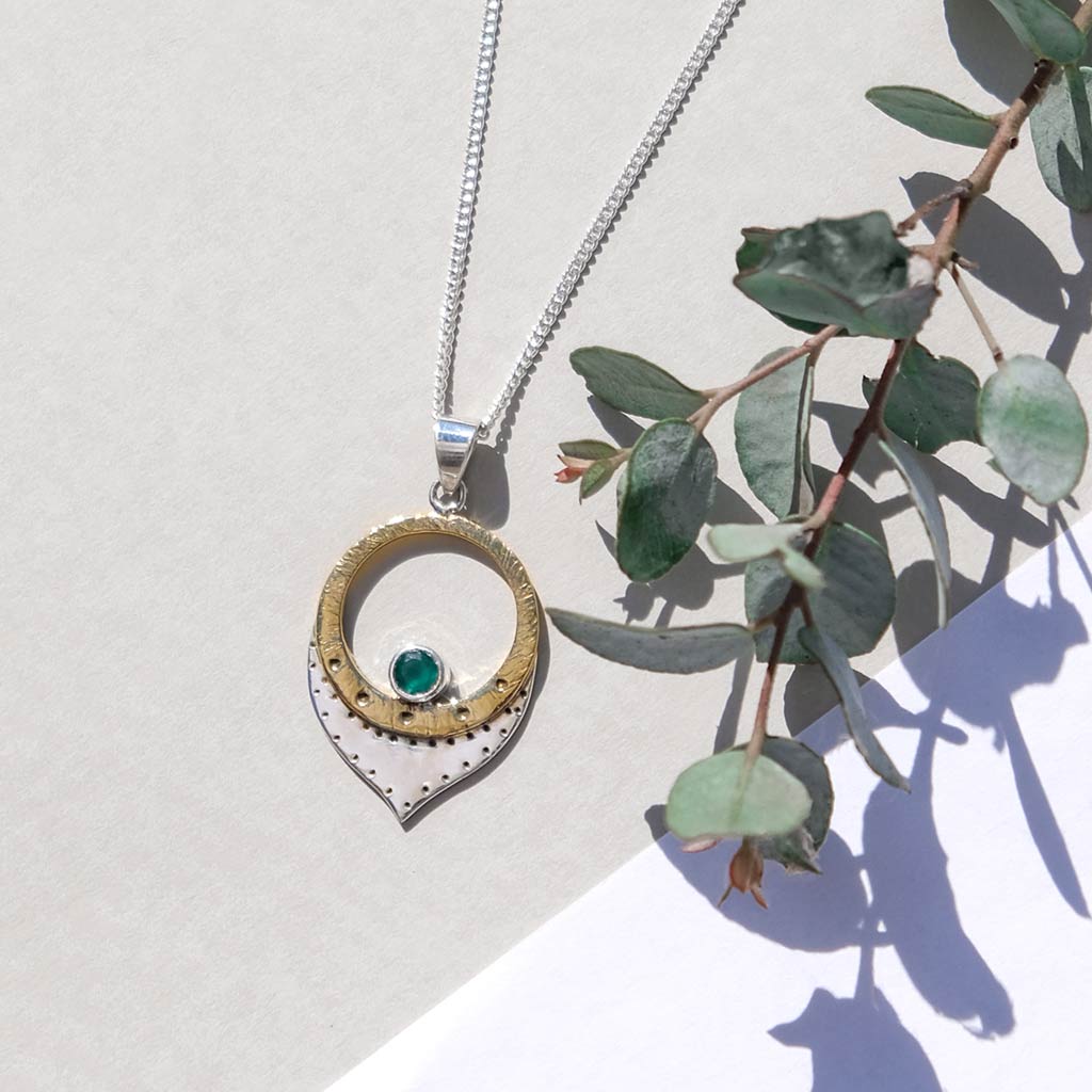Sundar means ‘beautiful’ in Hindi, and the Sundar Necklace is precisely that. Beautifully handcrafted in the vibrant state of Rajasthan, it features an ornate silver and brass pendant with a genuine green onyx gemstone suspended on an elegant silver chain. As part of the ethical jewellery collection, the Gemstone Sundar Necklace is the perfect gift for those who love to accessorise their outfits with handmade necklaces. Wear it solo with office edits for a chic workday look, or layer it with other chains, chokers and green onyx pendants for festivals, beach days, and fun nights under the stars.