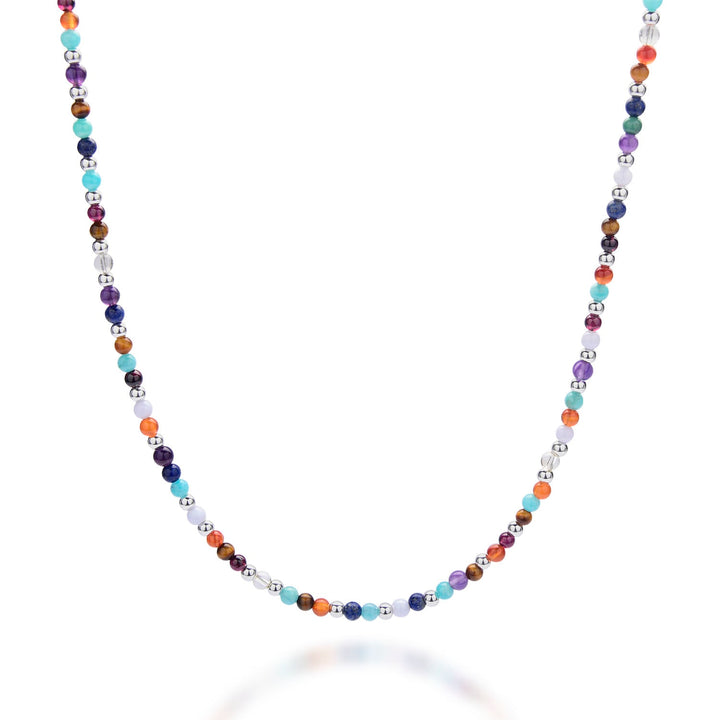 This necklace is made of sterling silver and features various 4mm semi-precious gemstones, including Blue Lace Agate, Amazonite, Tigers Eye, Garnet, Crystal, Carnelian, Lapis, and Amethyst.