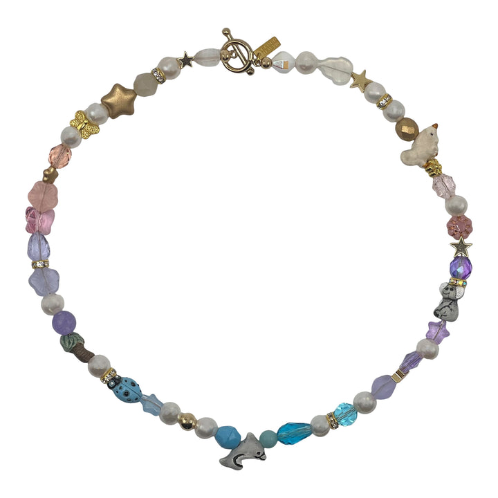 This beautiful, gradient design is both elegant and playful. The Courageous Necklace is perfect for that spring and summer look to show off your unique style and love for animals. This necklace is adorned with freshwater pearls, 14k gold filled and plated beads, Swarovski crystals, real gemstones, and glass beads. The handcrafted palm tree, ladybug, dolphin, koala, and unicorn give the necklace a sweet and colorful feel. Know that portions of every sale go towards helping shelter animals across the United States.