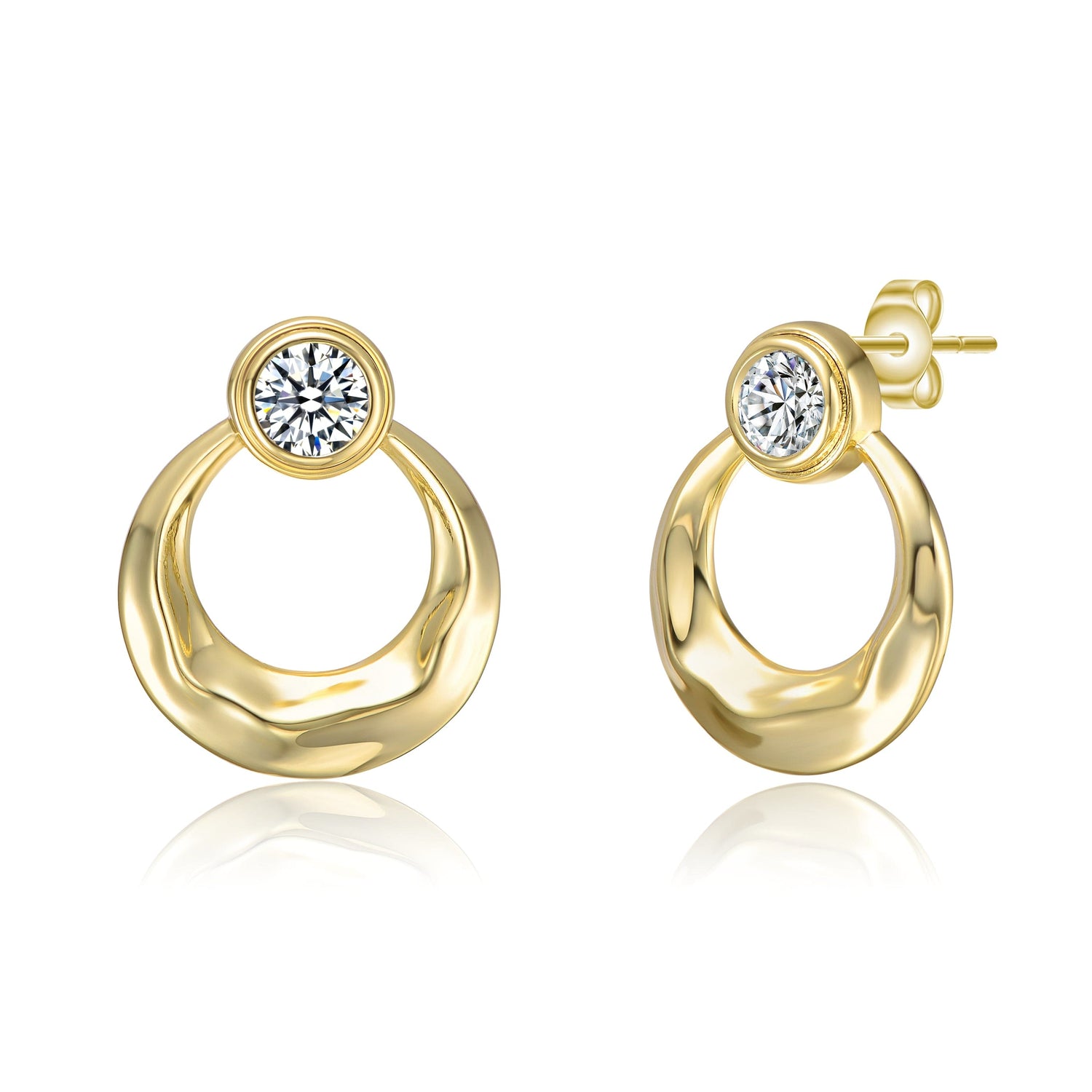 These Eternity Circle Hoop Earrings by Genevive Jewelry are crafted with a brightly polished 14K gold-plated finish. The beveled eternity circles in a drop setting create an elegant look, while sparkling cubic zirconia solitaires are bezel-set on top, adding a double dose of modern glamour. Butterfly backs keep these front-facing hoops secure and flush on the earlobes.