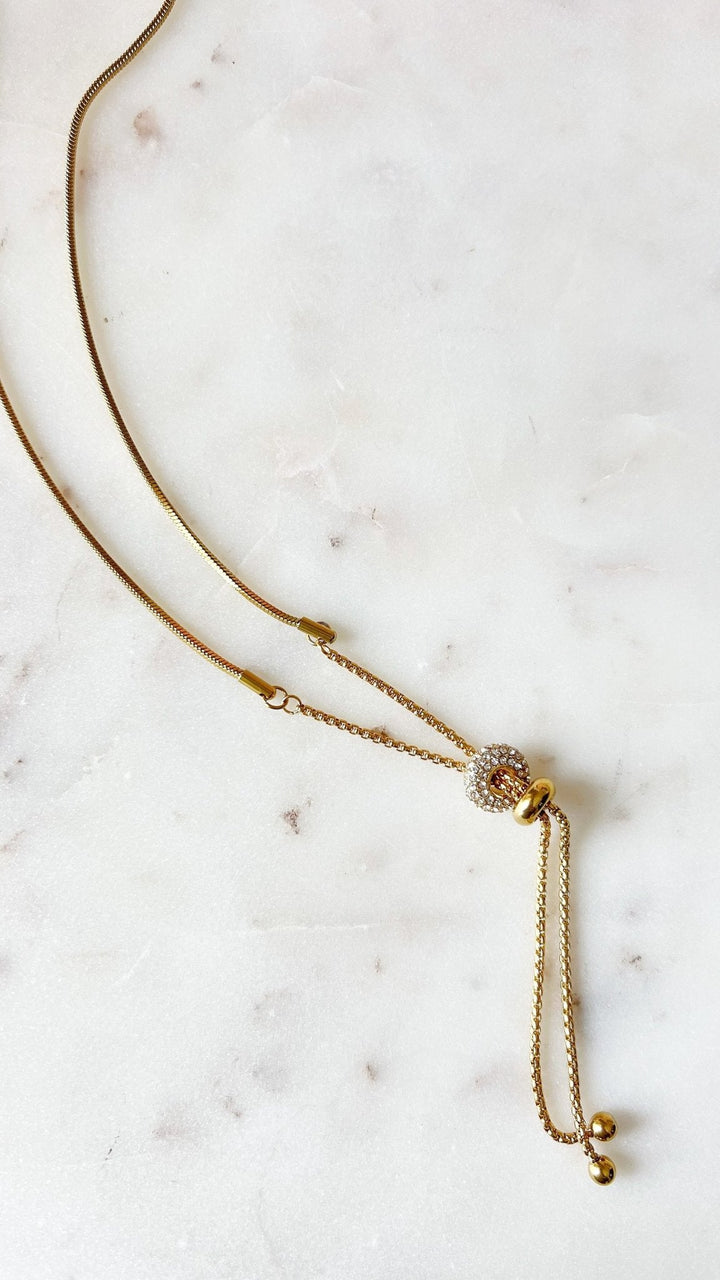 This bolo necklace is made with an 18K gold-filled herringbone chain and features a gold ring and a cubic zirconia ring. It is hypoallergenic and anti-tarnish.