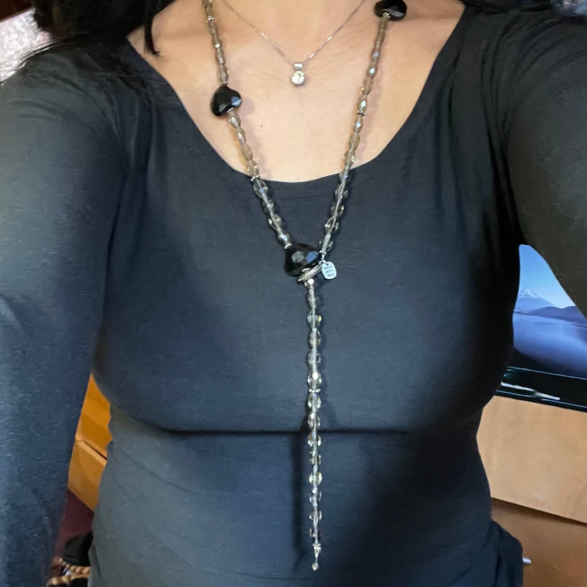 This Felicia Four Black Crystal Hearts Necklace by Amy Delson Jewelry is a one-of-a-kind heirloom piece that embodies timeless love and friendship. It features faceted black hearts and vintage grey crystal beads, meticulously accented with hematite for exceptional grounding energy. This versatile necklace symbolizes an attraction of positive energy and can be worn in two distinct ways—either long for a classic look or as a stylish Y necklace. Its unique design and meaningful materials make it a cherished piece to be passed down through generations.