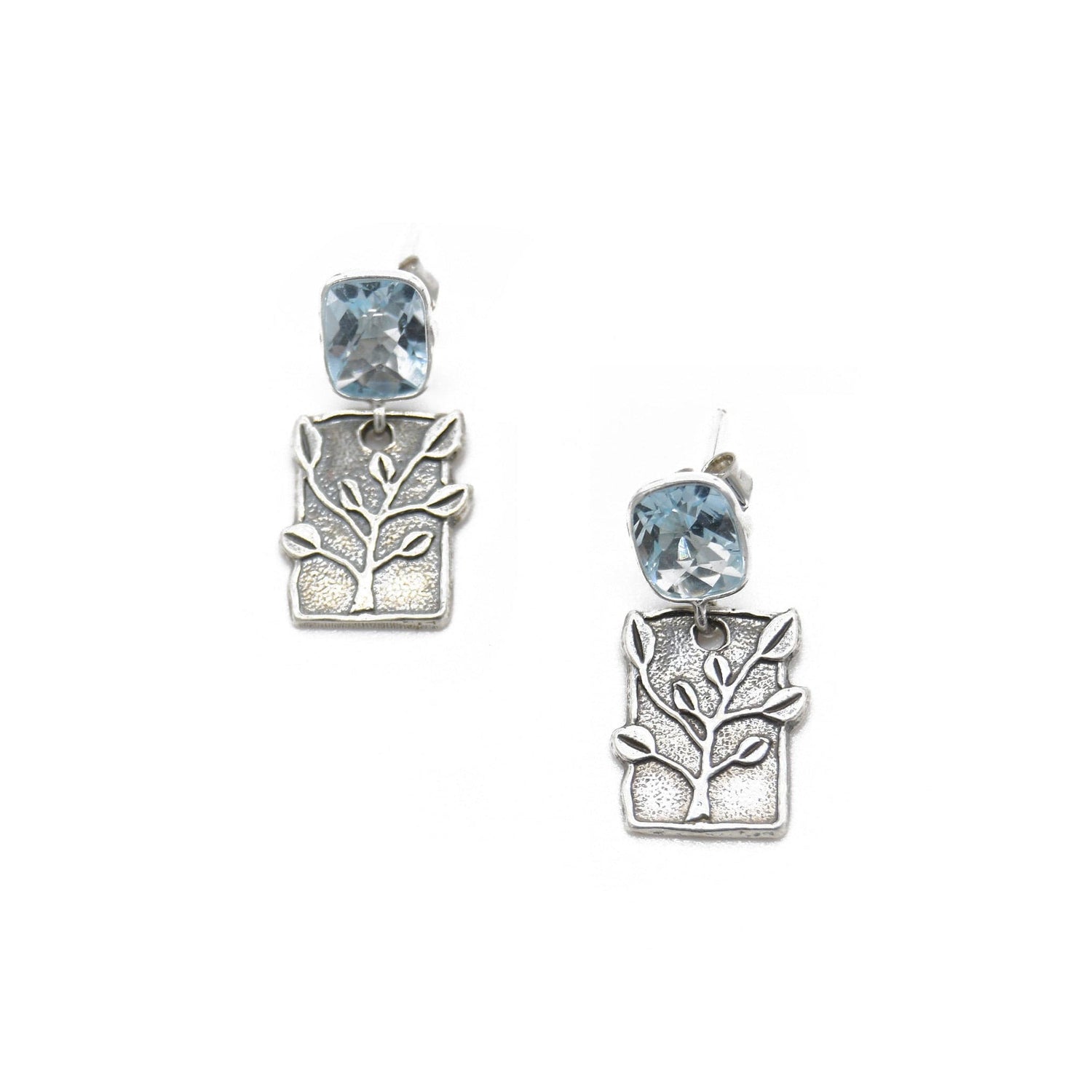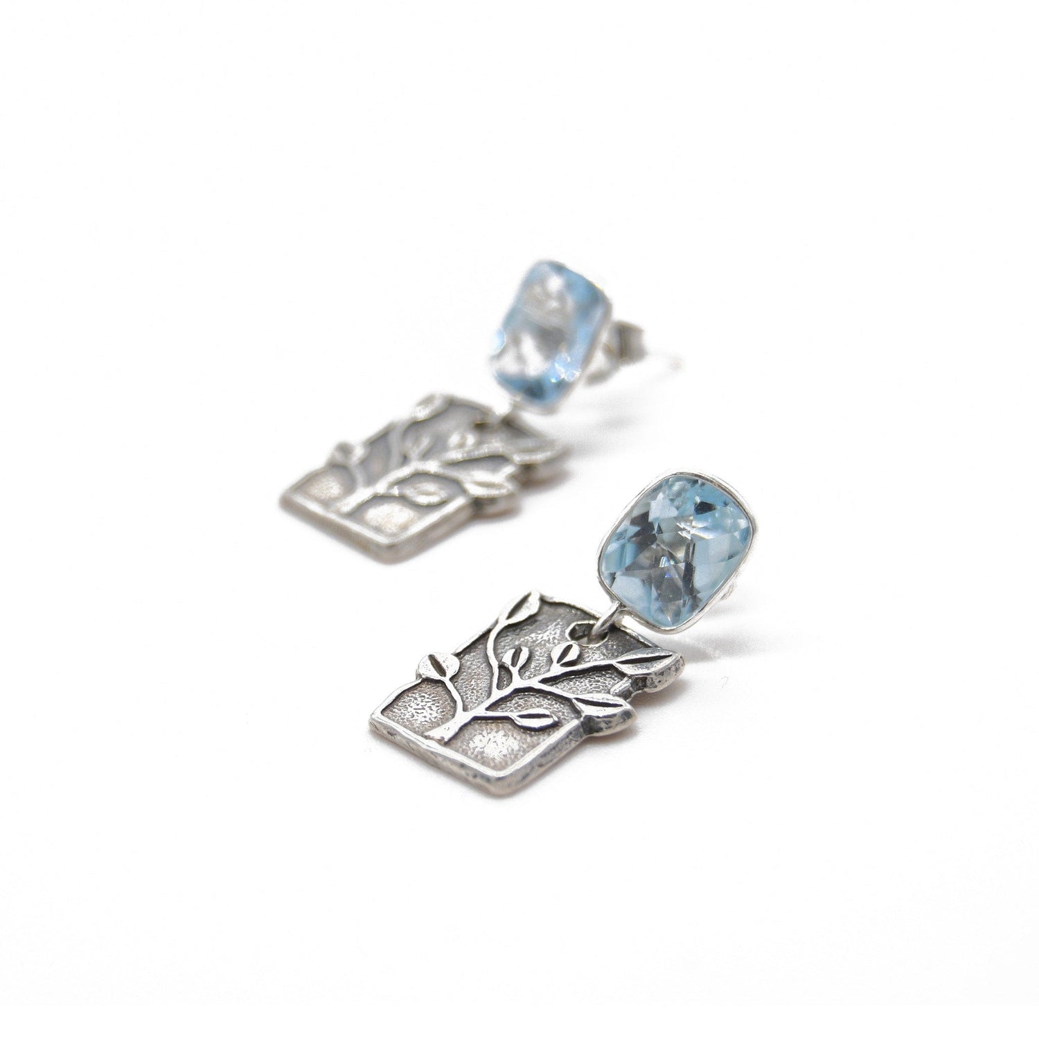 These post-back earrings are handmade with a sterling silver branch pendant, sterling silver post, and a natural Blue Topaz stone. They are both nickel and lead-free.