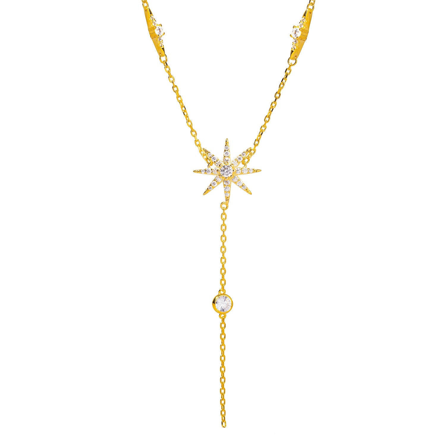 Unveil the magic of the stars with our Stellar Radiance Gold & Diamond Necklace, a piece that captures celestial beauty and spiritual elegance. Crafted from high-quality 18K gold plated on sterling silver, this necklace features a captivating star pendant adorned with sparkling diamonds. The unique design is enhanced by a delicate chain with additional diamonds cascading from the pendant, adding an extra touch of brilliance. These diamond accents along the chain make this necklace truly stand out, offering a distinct and enchanting style. Perfect for those who seek both beauty and meaning, this necklace is a radiant addition to any jewelry collection.