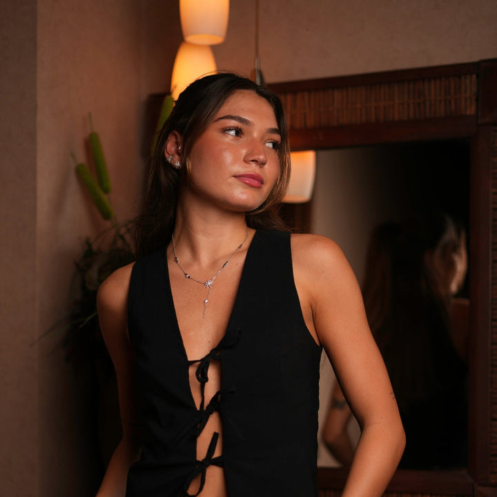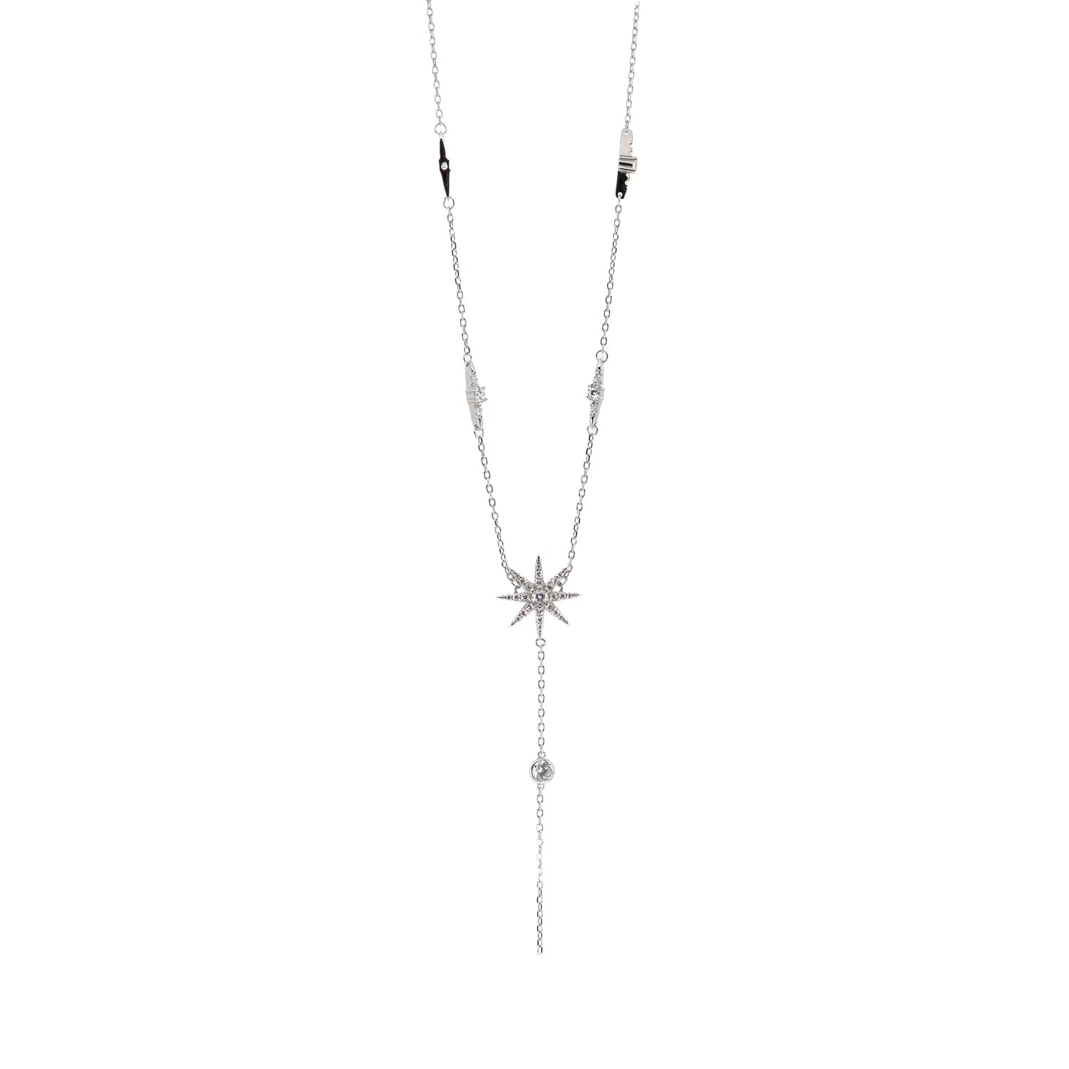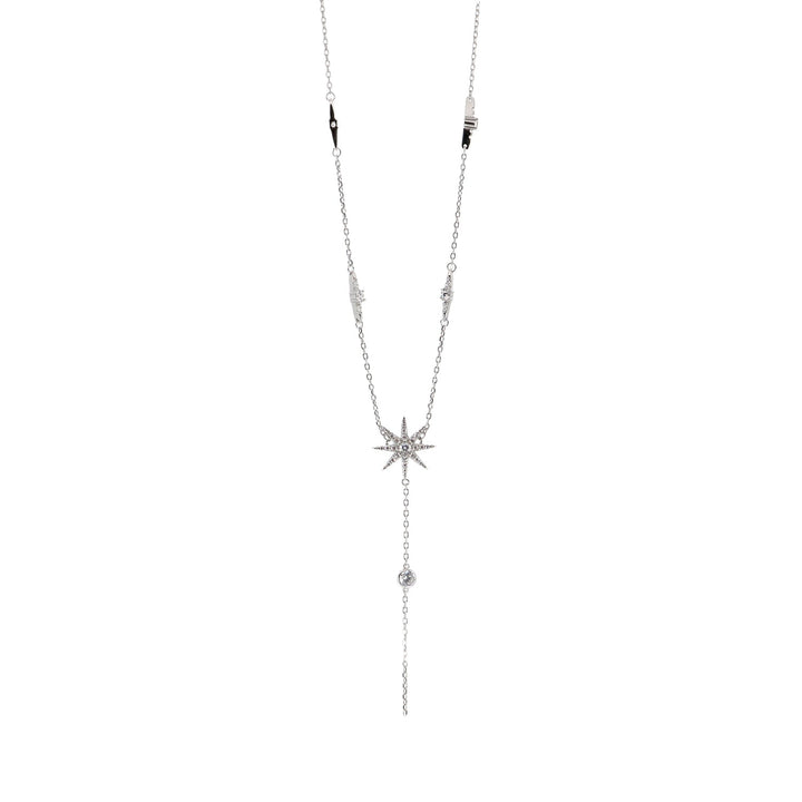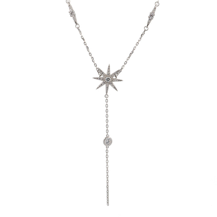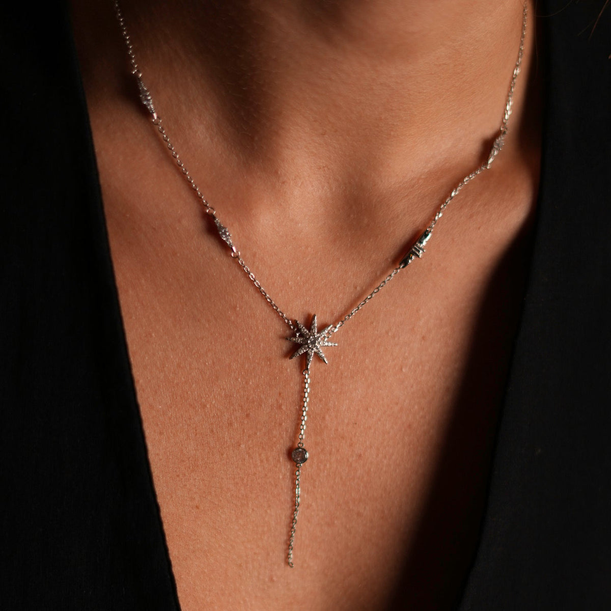 Unveil the magic of the stars with our Stellar Radiance Sterling Silver & Diamond Necklace, a piece that captures celestial beauty and spiritual elegance. Crafted from high-quality sterling silver, this necklace features a captivating star pendant adorned with sparkling diamonds. The unique design is enhanced by a delicate chain with additional diamonds cascading from the pendant, adding an extra touch of brilliance. These diamond accents along the chain make this necklace truly stand out, offering a distinct and enchanting style. Perfect for those who seek both beauty and meaning, this necklace is a radiant addition to any jewelry collection.