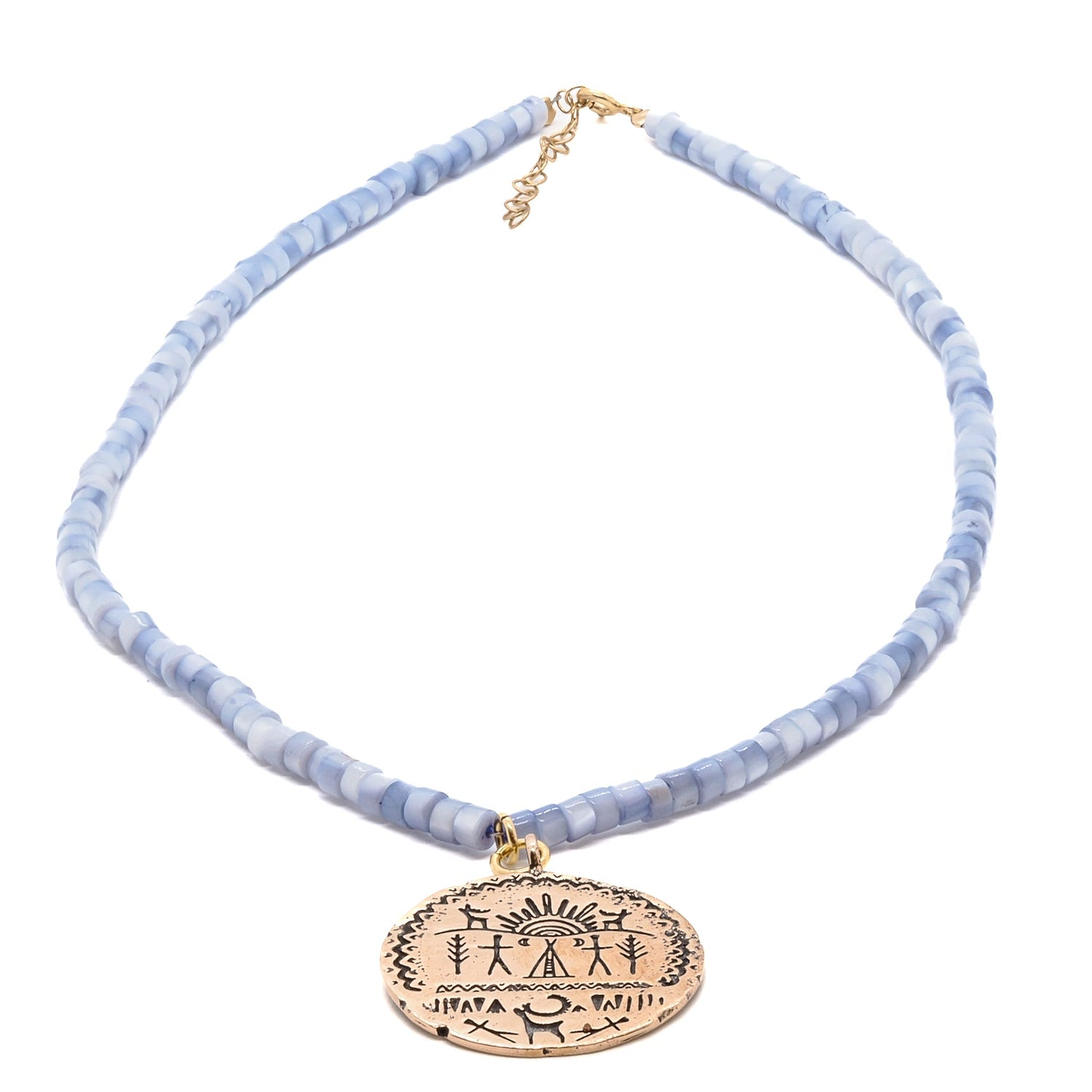 This Shaman Necklace is a beautiful and unique piece of jewelry that combines natural beauty and traditional craftsmanship to create a one-of-a-kind accessory. It's a must-have for anyone looking for a statement piece that is both spiritual and unique. The centerpiece of the necklace is a bronze Shaman drum pendant that is intricately designed with protection symbols. The pendant is beautifully crafted, with a unique texture and shine that complements the pearls. The drum shape of the pendant adds a sense of rhythm and movement to the necklace, making it a truly dynamic piece.
