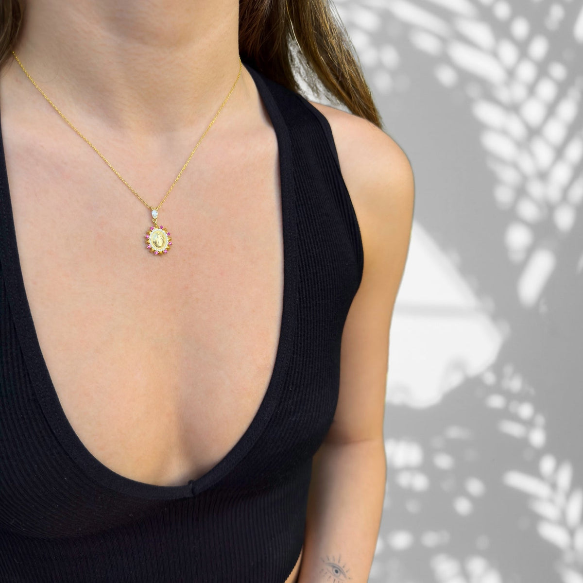 Virgin Mary Pendant Ruby & Diamond Gold Chain Necklace is a perfect blend of devotion and style, making it an ideal accessory for those who wish to carry a symbol of their faith in a fashionable manner. The centerpiece of the necklace is the exquisite Virgin Mary pendant. This pendant is also crafted from sterling silver and coated in the same 18k gold, creating a harmonious and seamless look with the chain. The depiction of the Virgin Mary is rendered with intricate detail, symbolizing purity, grace, and unconditional love, making this necklace not just a fashion statement but a piece with deep spiritual significance.