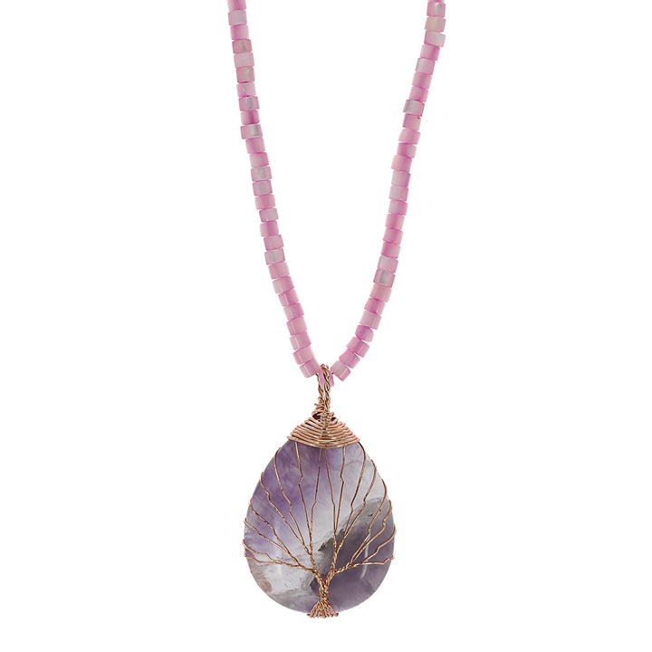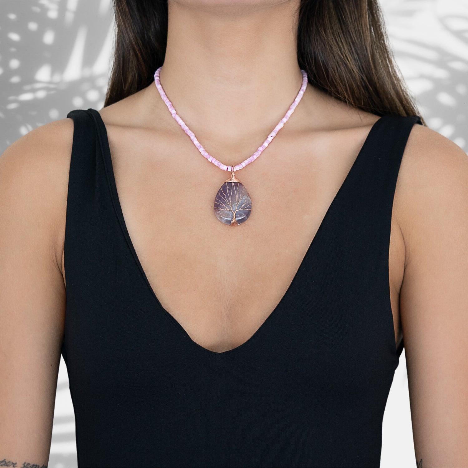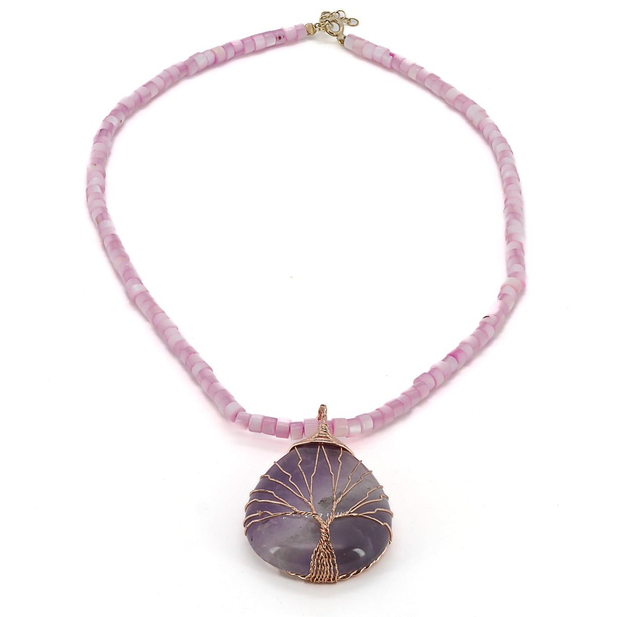 The Healing Amethyst Pendant Pearl Chain Beaded Necklace is an exquisite piece of handmade jewelry that combines the delicate beauty of a pink pearl chain with the captivating allure of a natural amethyst tree pendant. At the heart of this necklace lies the centerpiece—a stunning tree-shaped pendant made from natural amethyst gemstones. The tree's branches delicately curve and intertwine, symbolizing strength, growth, and harmony with nature.