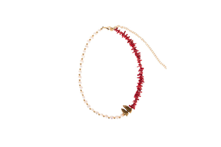 Adorn yourself with the timeless elegance of our Cora Pearl Necklace, featuring freshwater pearls with red coral detailing and a gold-plated brass clasp fastening on Hematite. Crafted with care and attention to detail, each necklace is a testament to the beauty of artisanal craftsmanship. Handmade with love, it's a versatile piece that adds a touch of sophistication to any ensemble. A must-have accessory for those who appreciate the finer things in life.