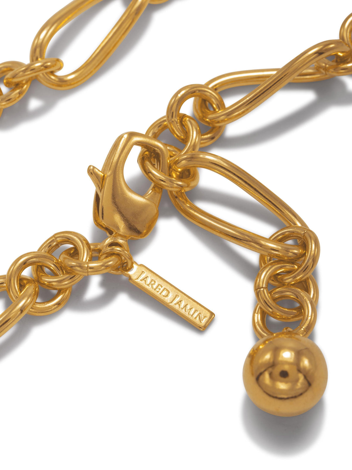 This Gold Skyler Chain Bracelet by Jaredjamin is a classic and elegant accessory that effortlessly pulls any look together. The 18K gold-plated brass chain link design offers a timeless flair, and its lightweight feel makes it comfortable for all-day wear. This bracelet is a perfect statement piece for adding a touch of sophistication to your style. Its durable design ensures that it will maintain its beauty for many years with the right care.